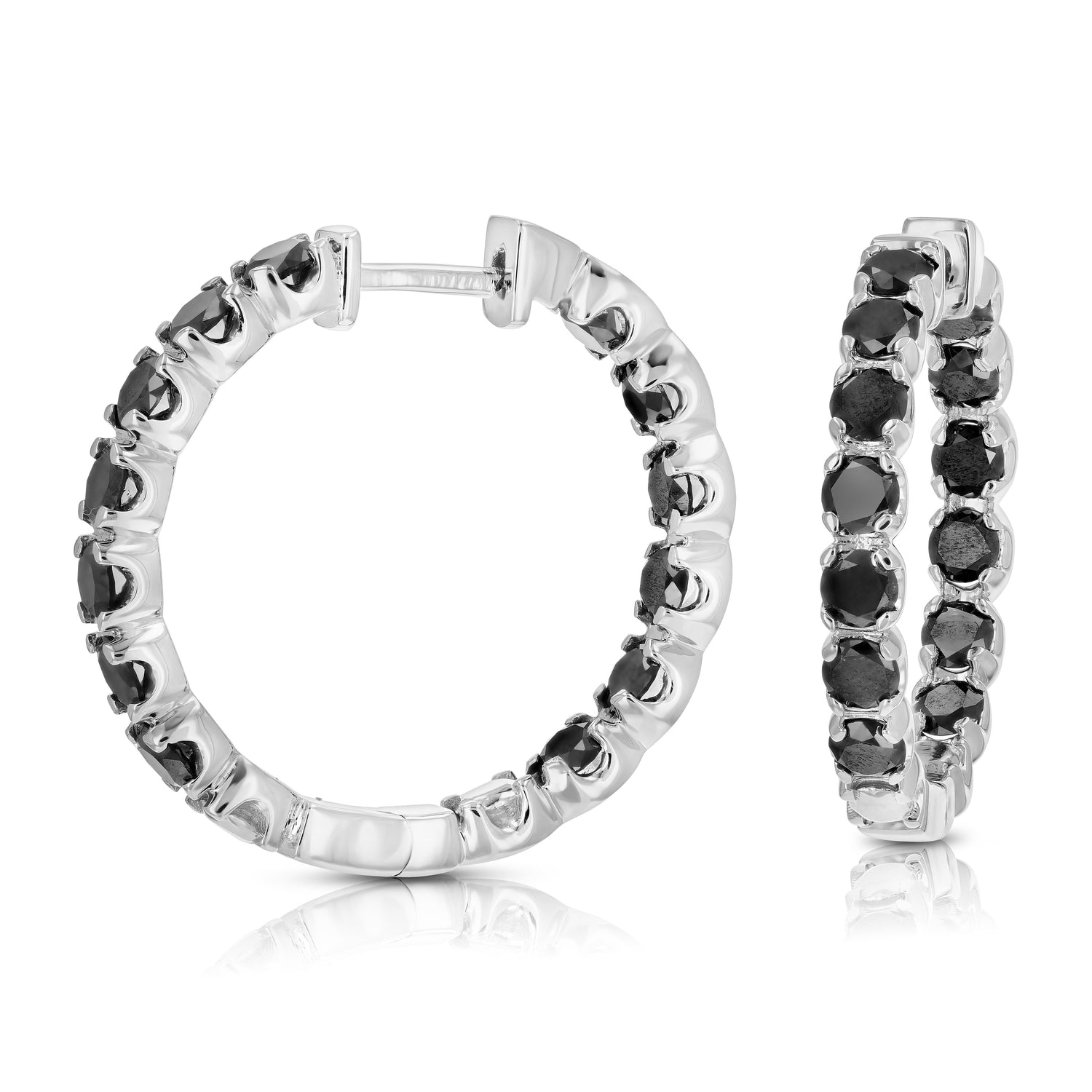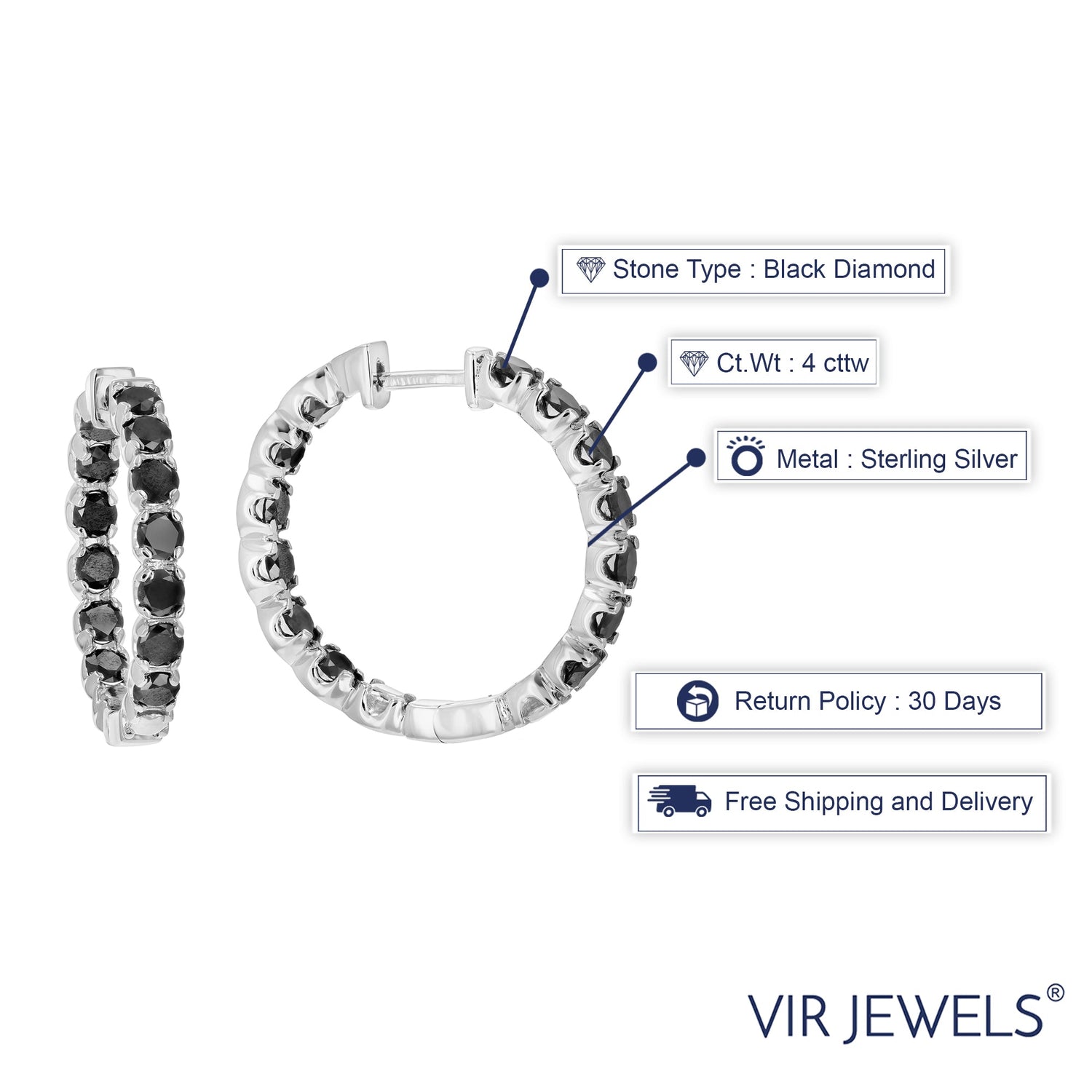 These 4 cttw Black Diamond Hoop Earrings by Vir Jewels are designed with 26 natural round black diamonds, set in a prong setting to create a stunning inside-out design. Made with .925 sterling silver and rhodium plating, these 1-inch height hoops are the perfect statement piece for evening wear.