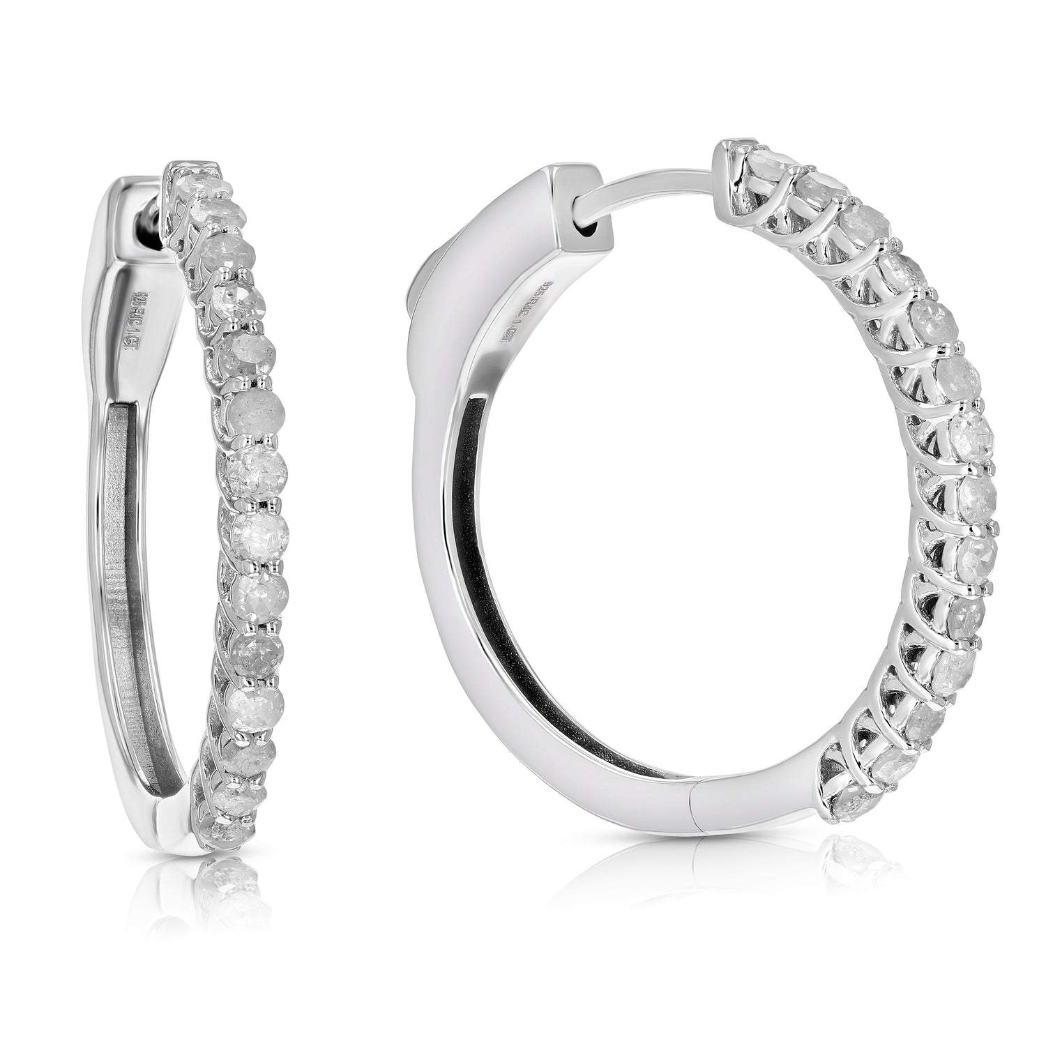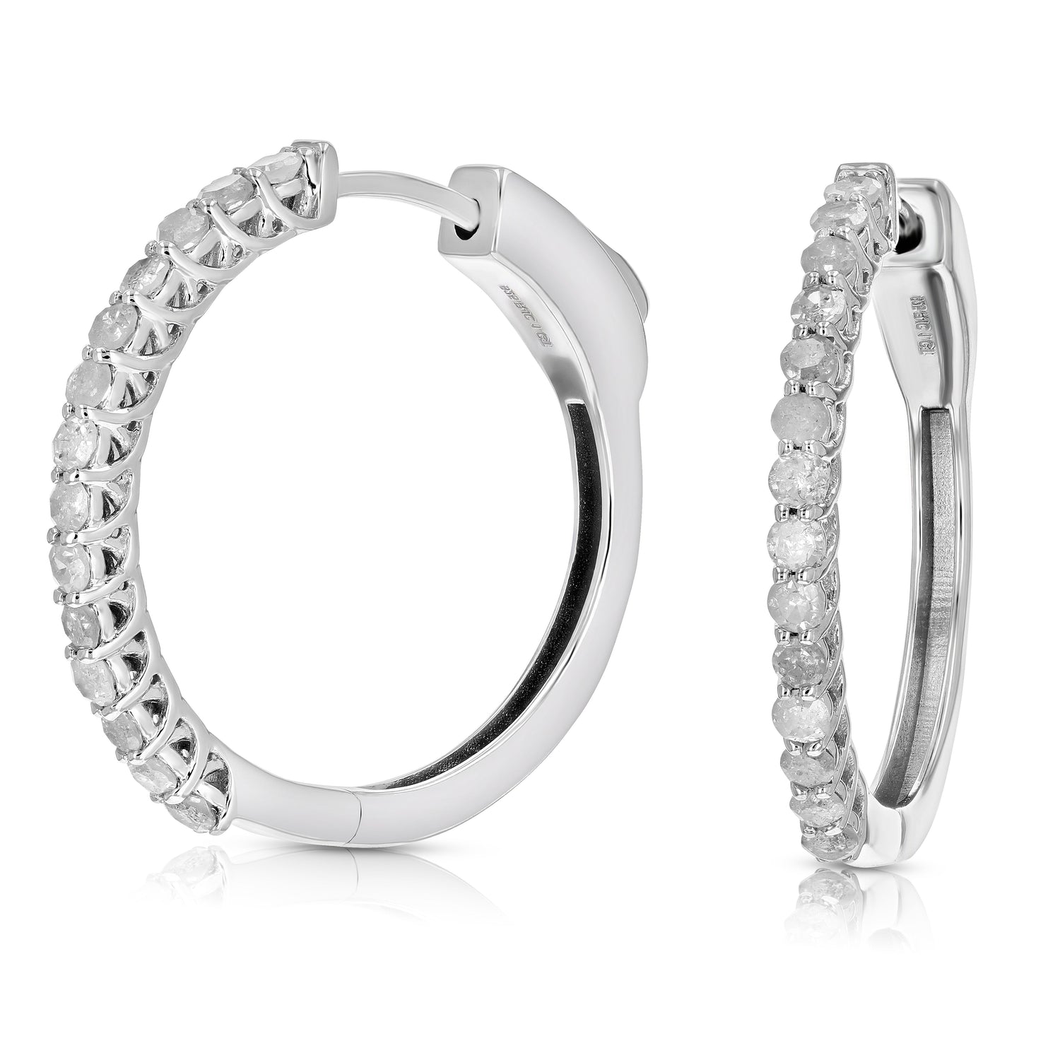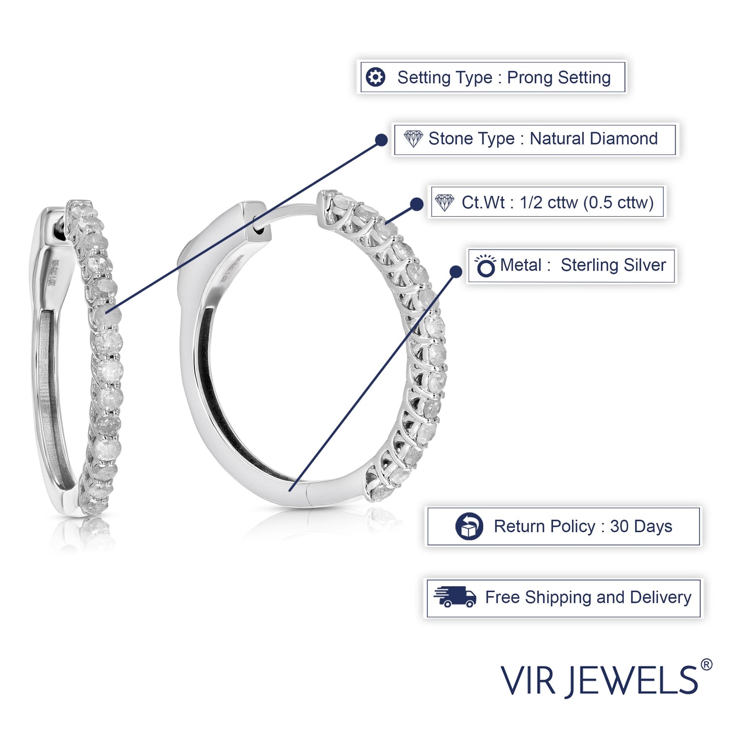 These 1/2 cttw Diamond Hoop Earrings by Vir Jewels feature 32 sparkling natural round diamonds set in a prong setting. Made with .925 sterling silver and rhodium plating, these 3/4-inch height hoop earrings are ideal for adding a touch of elegance and sparkle to any occasion.