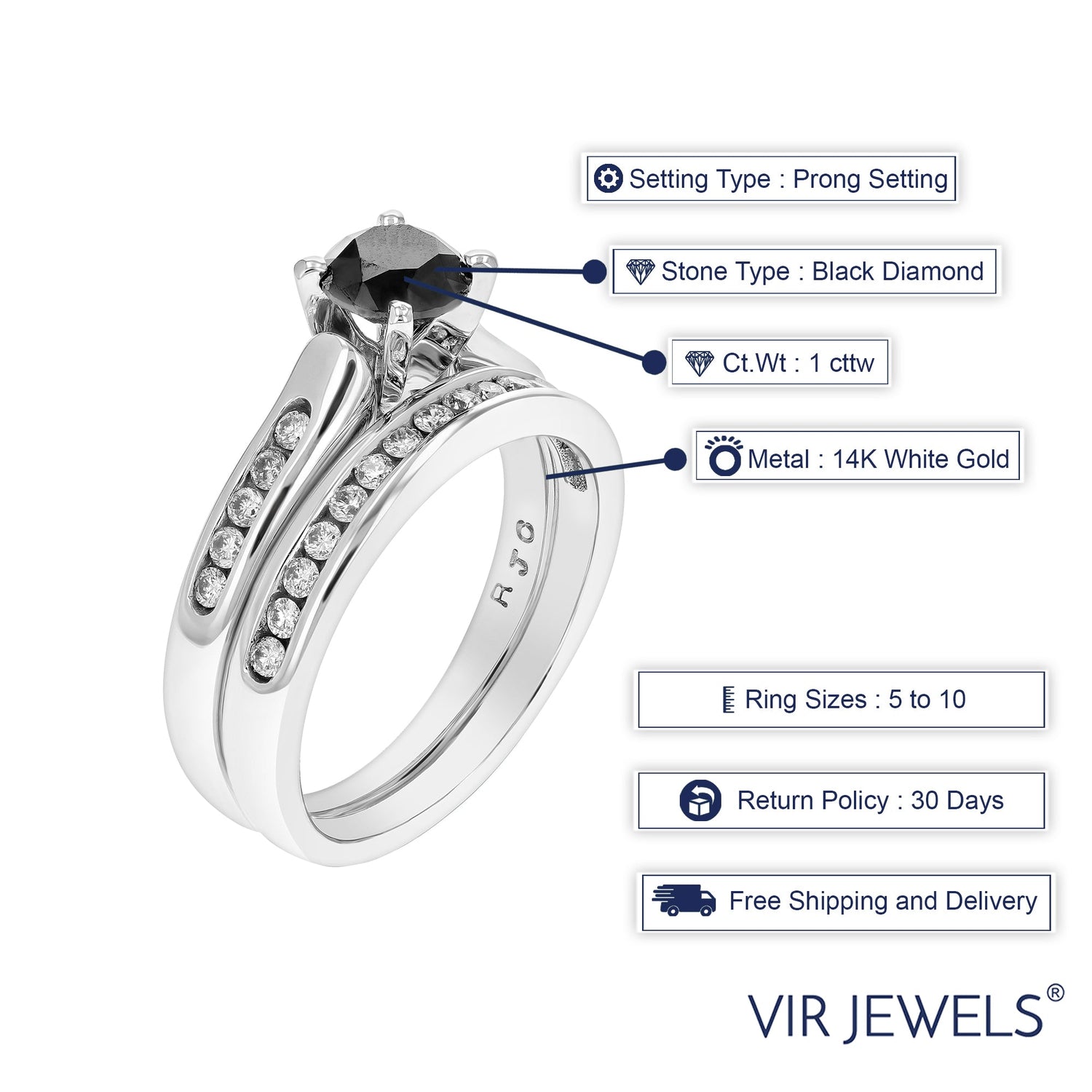 This 1 cttw Black Diamond Wedding Engagement Ring Bridal Set by Vir Jewels is the epitome of refined luxury. The black and white diamonds, set in a channel and prong setting, create a stunning contrast that is both bold and romantic. With 26 natural round diamonds, the ring showcases a perfect blend of tradition and modernity, making it an ideal choice for a meaningful proposal or anniversary.