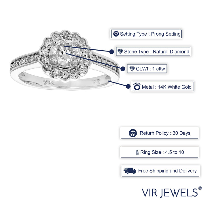 This 1 cttw Cluster Composite Diamond Engagement Ring by Vir Jewels showcases a unique cluster of 21 natural round diamonds, set in prong settings to create a dazzling effect. The diamonds are carefully arranged to maximize their brilliance, symbolizing unity and eternal love. Ideal for those seeking a distinctive, bold engagement ring, this piece is a perfect balance of luxury and originality.