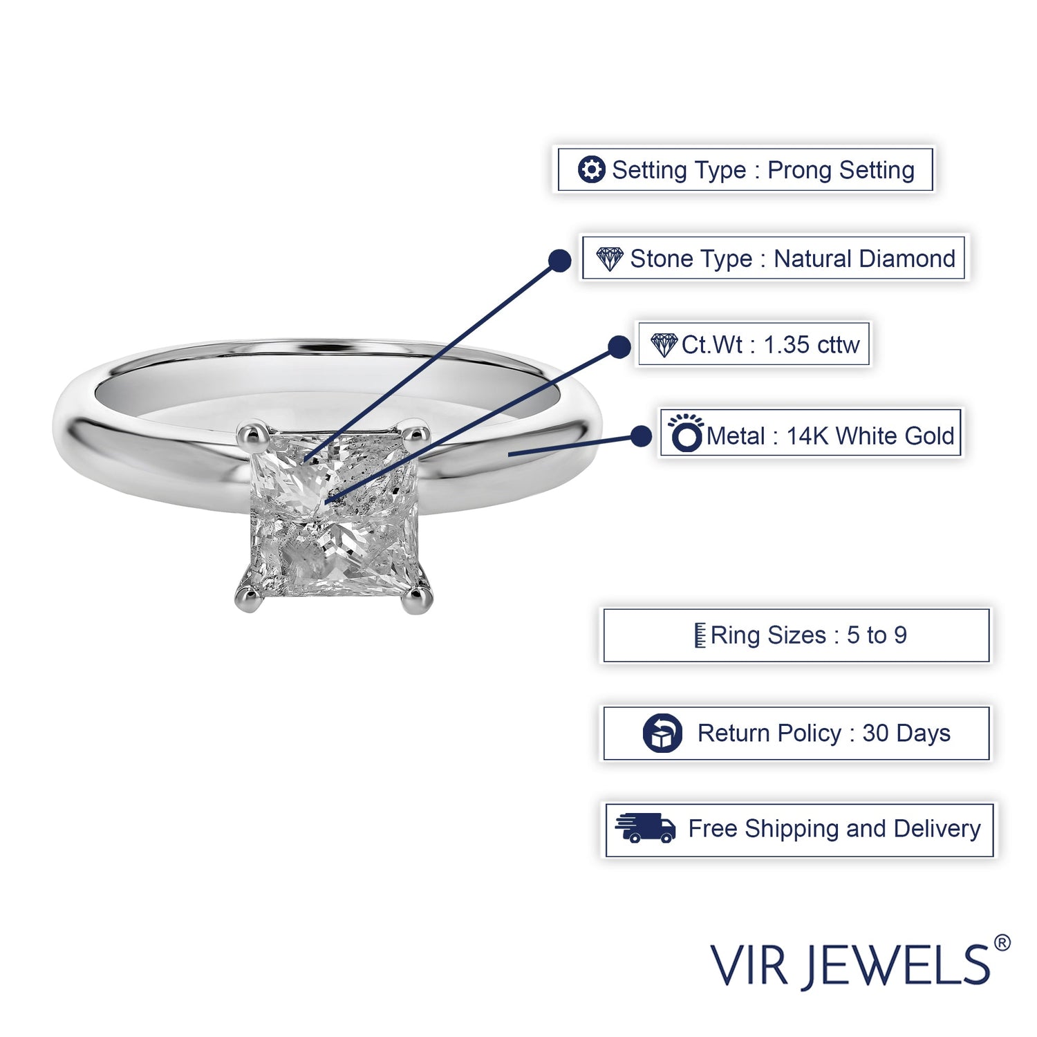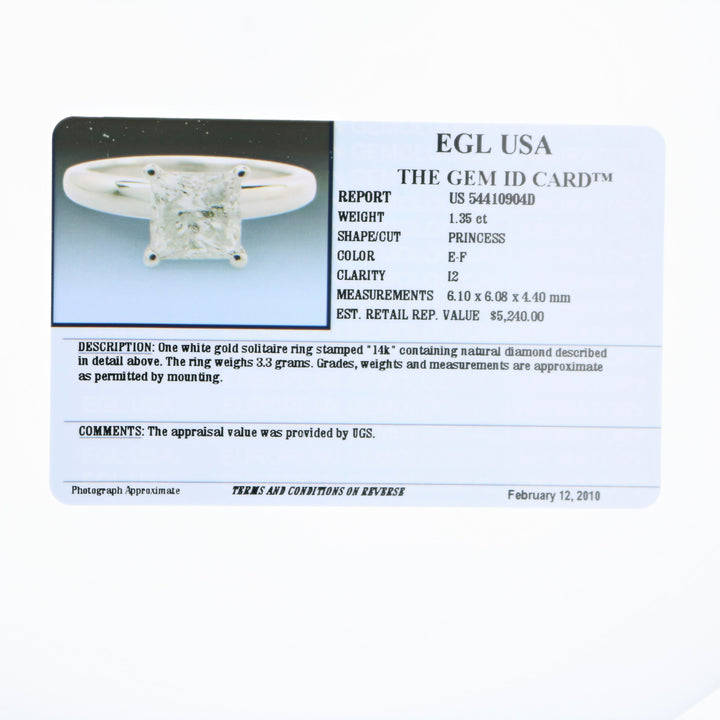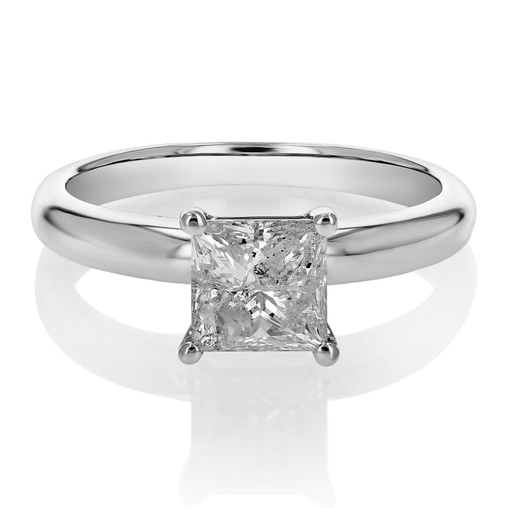 Crafted in 14K white gold with a 1.35 cttw princess-cut natural diamond. Diamond color: E-F, clarity: I2. Prong setting. Ring width: 7mm, length: 7mm. Metal weight: 3 grams.