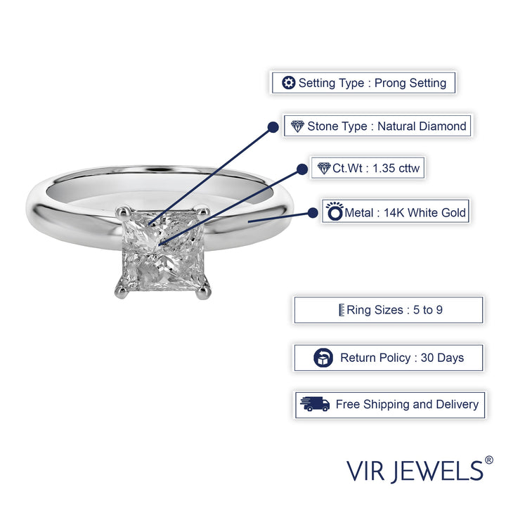 1.35 cttw Princess Diamond Solitaire Engagement Ring 14K White Gold Prong