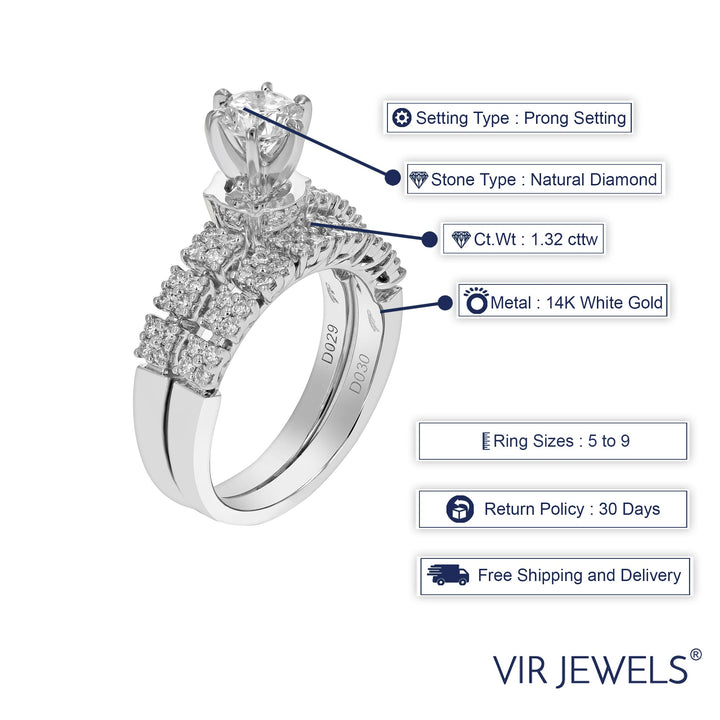 1.32 cttw SI3 Diamond Wedding Engagement Ring Bridal Set 14K White Gold
