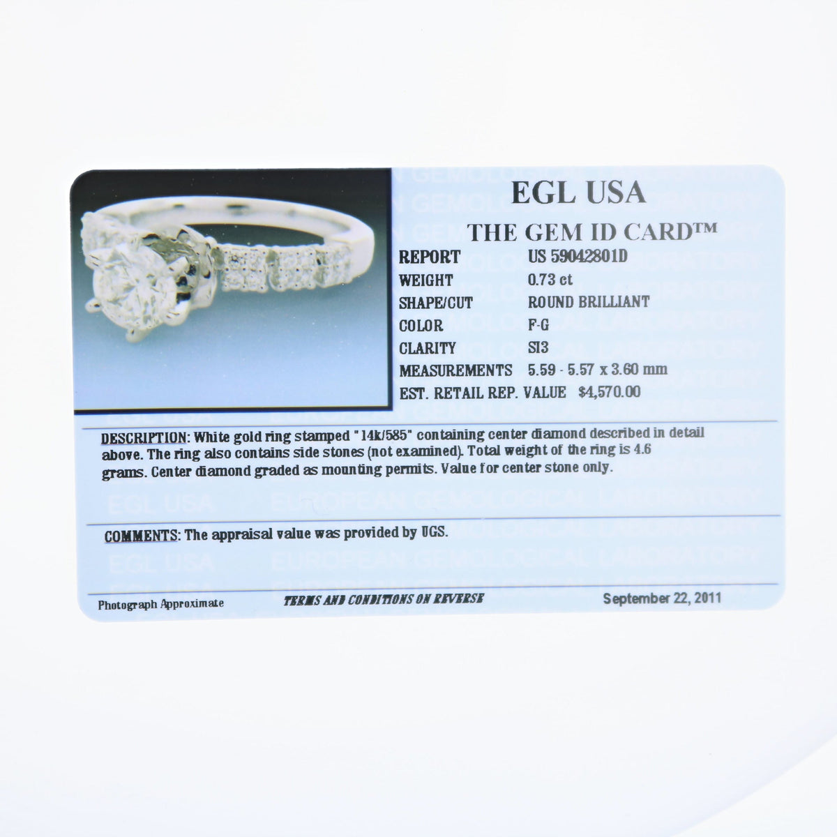 Handcrafted in 14K white gold with 1.32 cttw of round-cut natural diamonds (0.73 cttw center, 0.59 cttw side diamonds). Diamond color: F-G, clarity: SI3. Prong setting. Ring width: 7mm, length: 7mm. Metal weight: 7 grams.