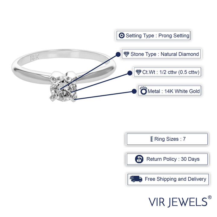 This 1/2 cttw SI1 Diamond Solitaire Engagement Ring by Vir Jewels is perfect for the bride who seeks simplicity and elegance. The round-cut natural diamond is set in a prong setting, with I-J color and SI1 clarity, making it a symbol of everlasting love. This 1/2 cttw ring in 14K white gold is ideal for those who appreciate clean lines and timeless beauty.