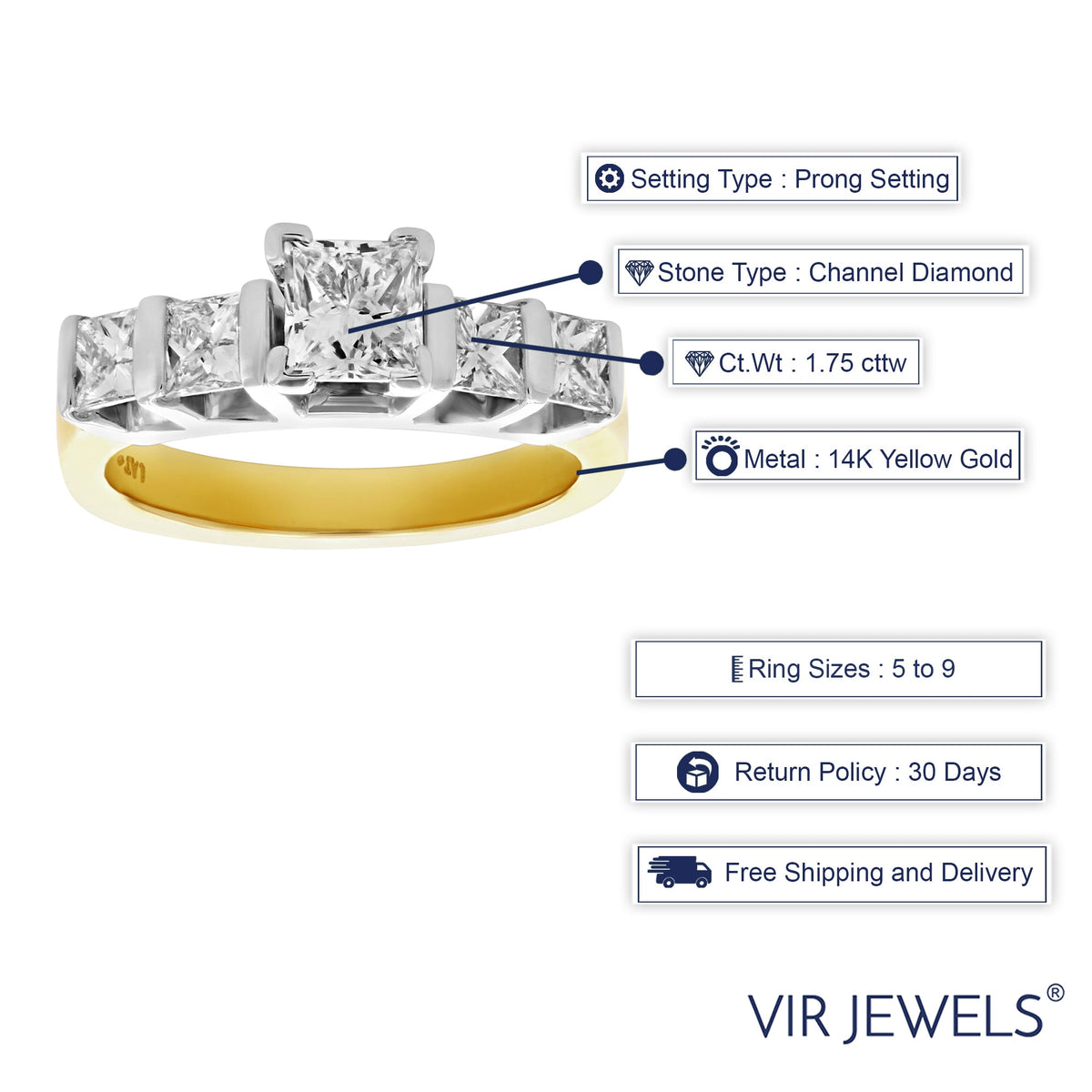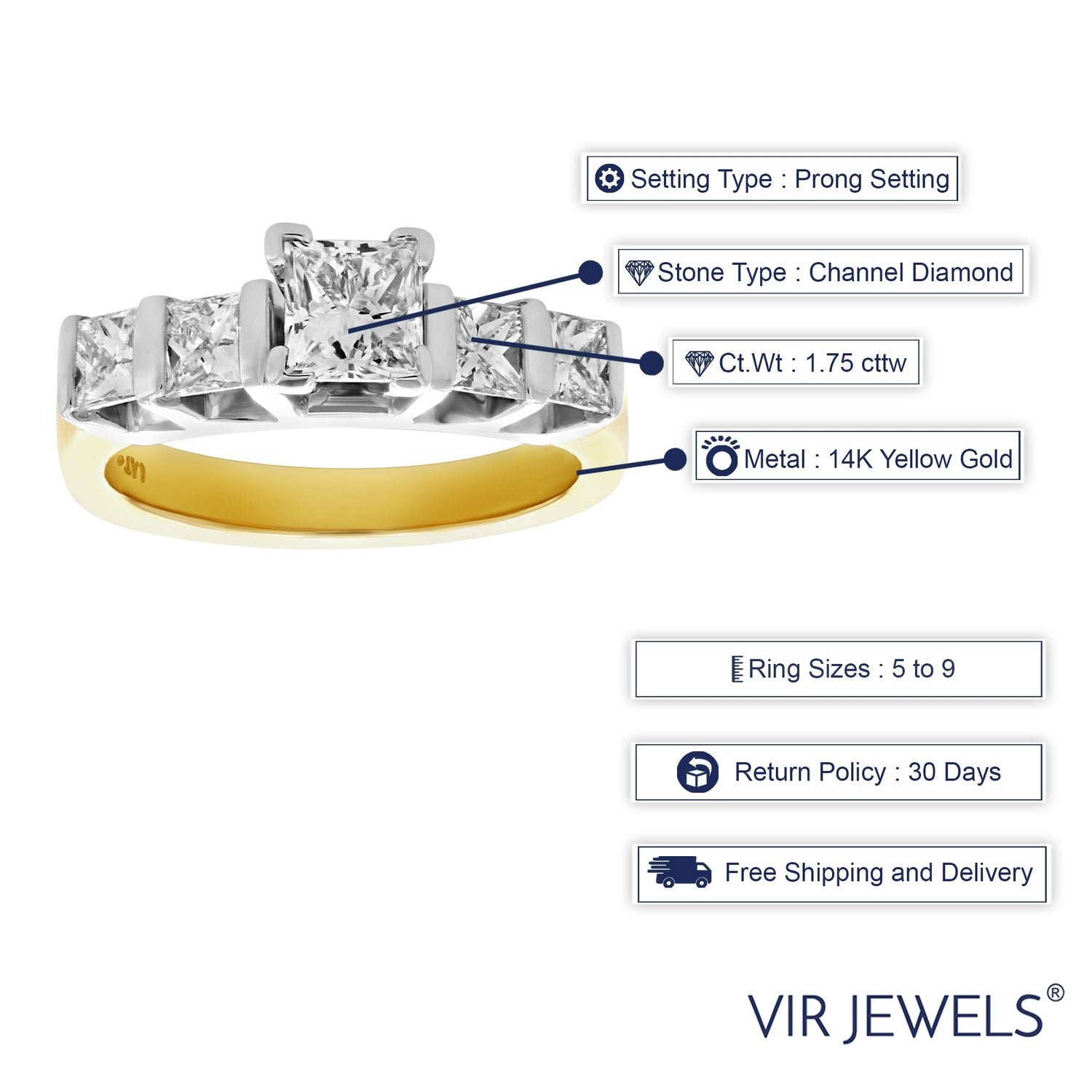 This 1.75 cttw SI1 5-Stone Princess Diamond Engagement Ring by Vir Jewels is a bold and modern choice. The five sparkling princess-cut diamonds, set in a channel setting, symbolize the journey of love and commitment. With a total carat weight of 1.75 cttw, including a 0.94 cttw center diamond and 0.81 cttw in side stones, this ring exudes both luxury and elegance.