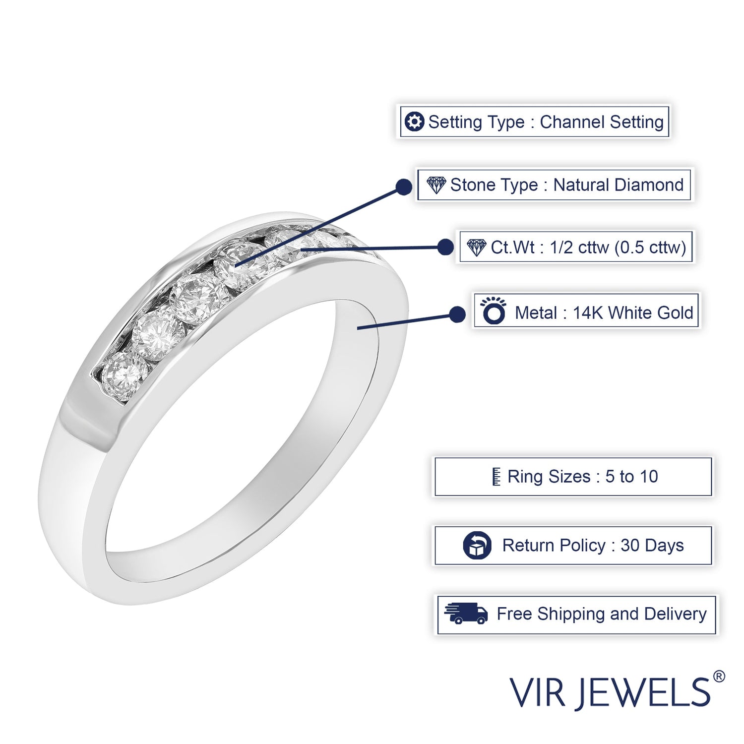 This 1/2 cttw SI1-SI2 Clarity Diamond Wedding Band by Vir Jewels adds a touch of elegance and sophistication to your wedding set. The seven sparkling natural round diamonds are set in a channel setting, with SI1-SI2 clarity and G-H color. Crafted in 14K white gold, this band perfectly complements an engagement ring, adding a subtle yet luxurious touch.
