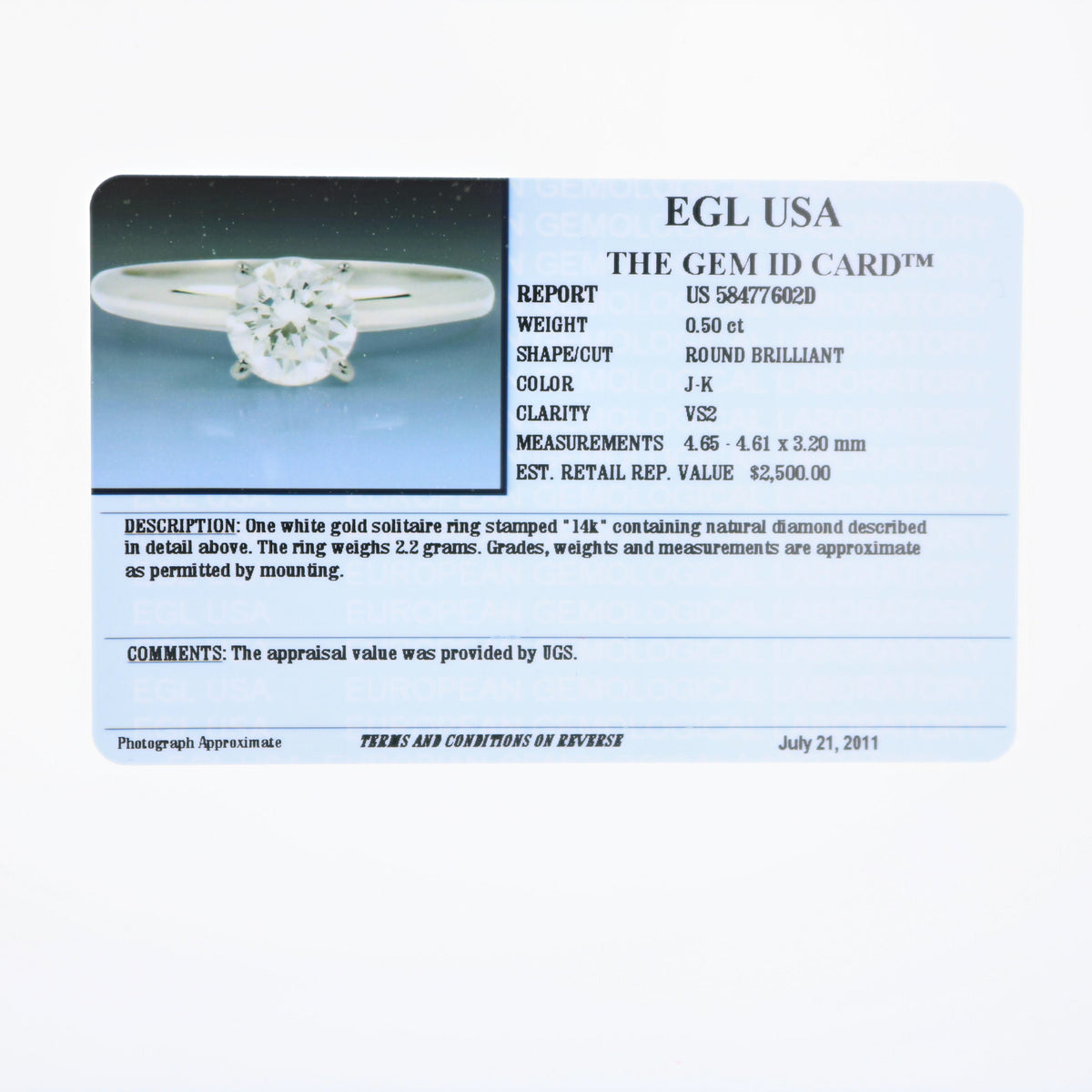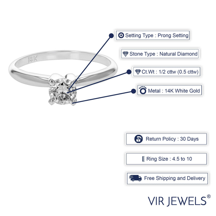 1/2 cttw VS2 Diamond Solitaire Engagement Ring 14K White Gold Round Prong