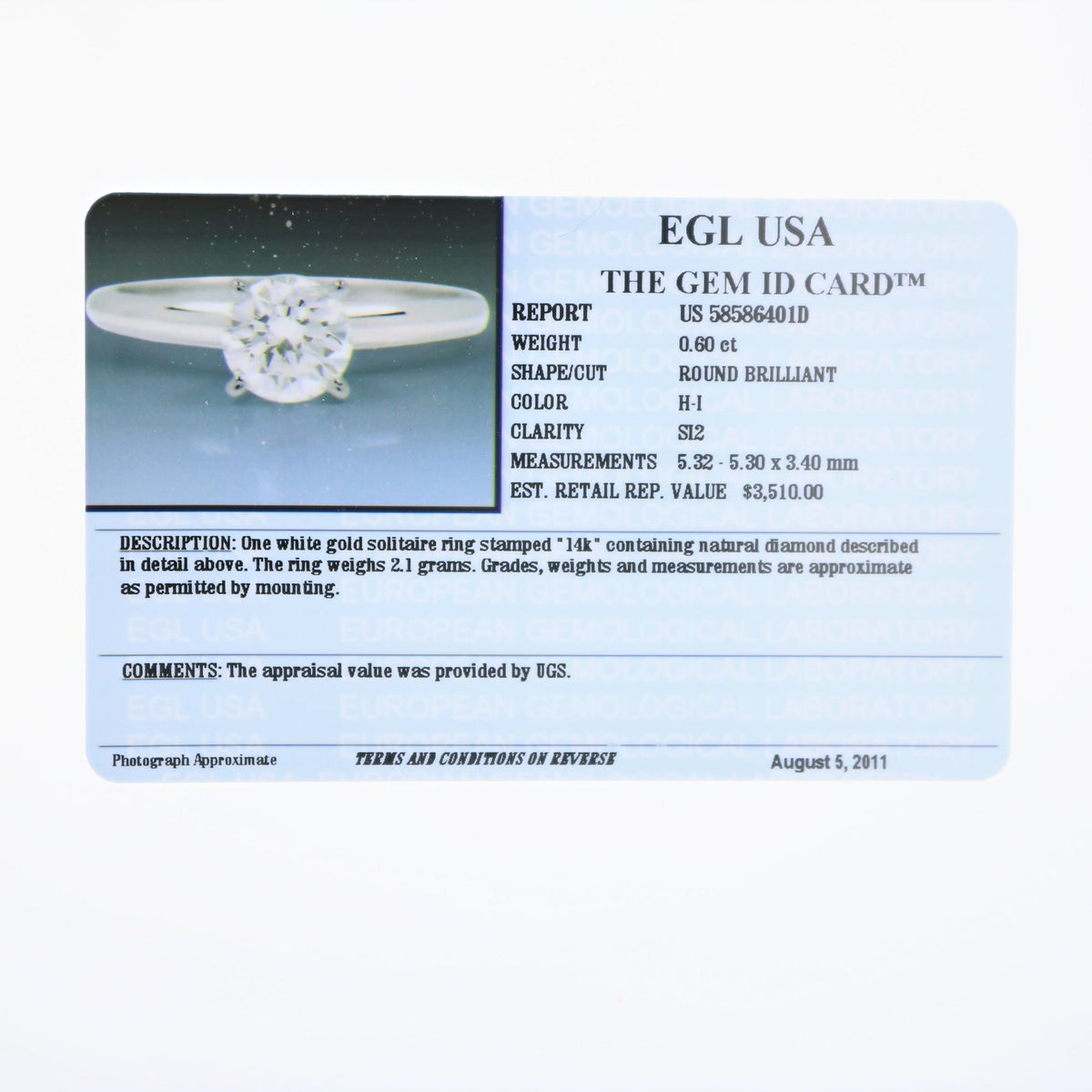 Crafted in 14K white gold with a 0.60 cttw round-cut natural diamond. Diamond color: H-I, clarity: SI2. Prong setting. Ring width: 5mm, length: 5mm. Metal weight: 2 grams.