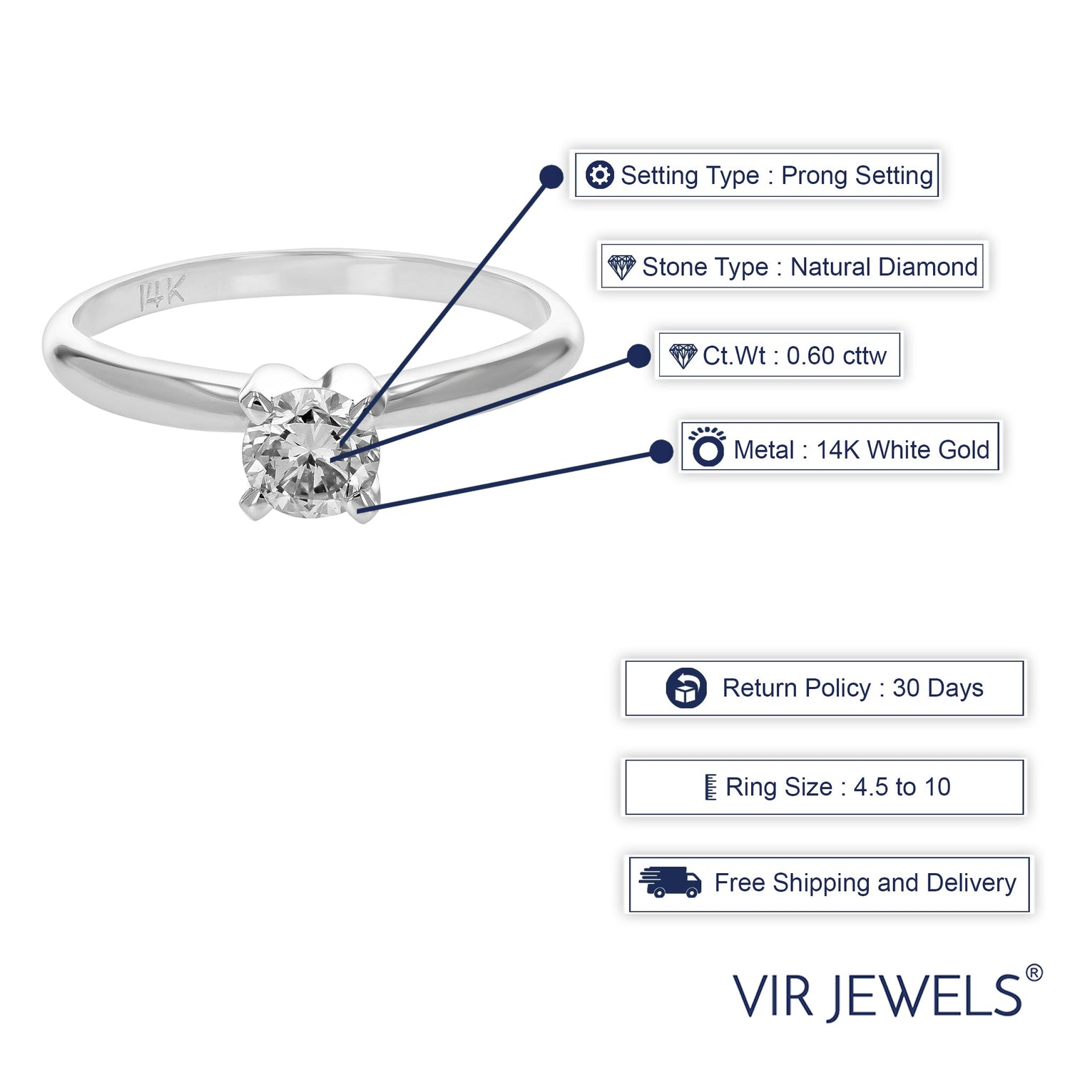 This 0.60 cttw SI2 H-I Diamond Solitaire Engagement Ring by Vir Jewels combines classic elegance with modern luxury. The sparkling round diamond, set in a prong setting, exudes a brilliant sparkle with its SI2 clarity and H-I color. This solitaire ring is the perfect choice for couples who value timeless design and superior craftsmanship.