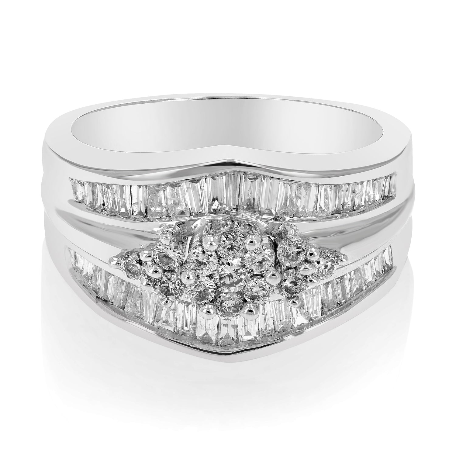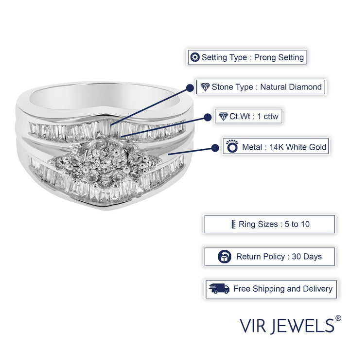Handcrafted in 14K white gold with 1 cttw of round-cut natural diamonds. Diamond color: G-H, clarity: SI3-I1. Prong setting. Ring width: 12mm, length: 19mm. Metal weight: 5 grams.