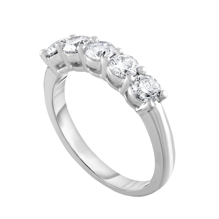 This 18K White Gold 1.00 ct. Wedding Band by Diana M features five round diamonds totaling 1.00 ct. The clean, minimalist design makes this band a perfect match for any engagement ring or a standalone piece. The diamonds symbolize eternal love, making it a timeless addition to any collection. Its simple yet sophisticated design ensures it will remain relevant for years to come.