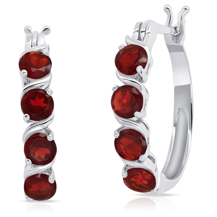 Handcrafted in sterling silver with garnet gemstones, each hoop measures 0.9 inches in diameter.