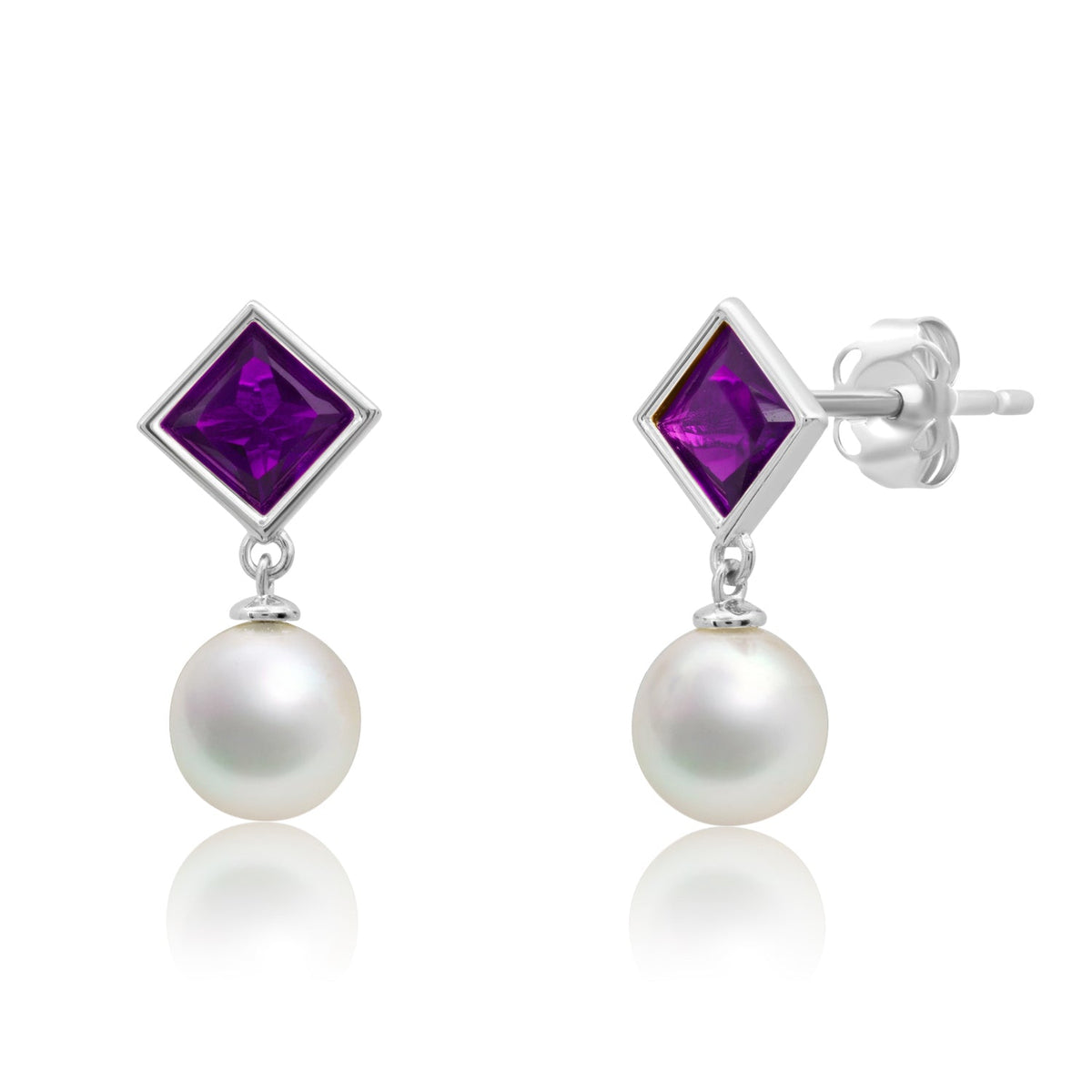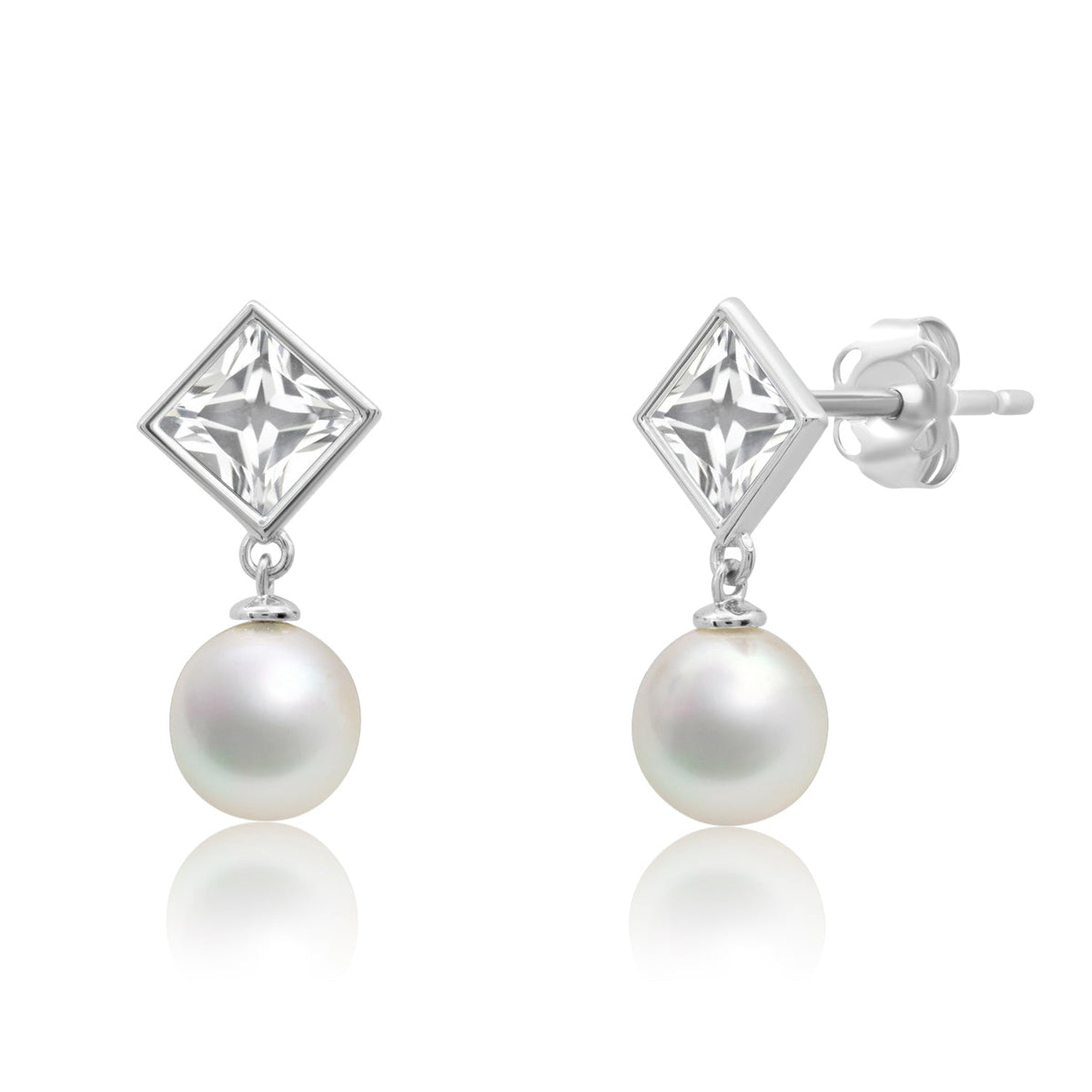 These Sterling Silver 6MM Cultured Pearl Dangle and 5MM Gemstone Stud Earrings by MaxColor offer a refined and elegant look. The 6mm cultured pearls are paired with a 5mm created blue sapphire gemstone, set in polished sterling silver. Perfect for adding a touch of luxury to both casual and formal outfits, these earrings make a statement with their timeless design.