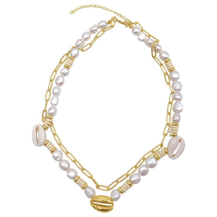 Pearl and Shell with Paper Clip Chain Double Necklace gold