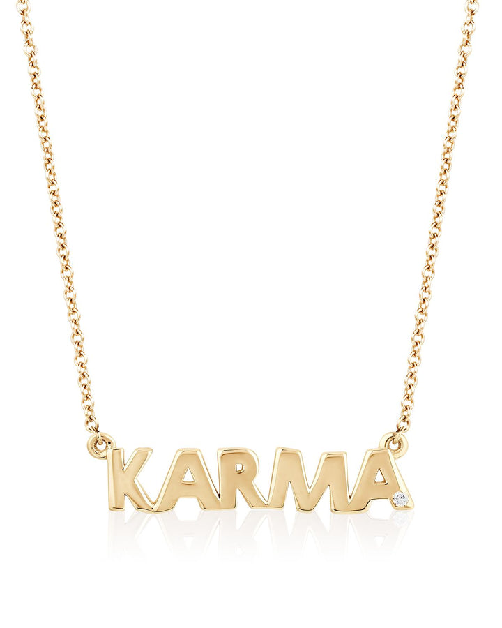 This Gold KARMA with One Diamond Necklace by Ariana Rabbani combines meaningful symbolism with elegance. The Karma symbol, representing the cycle of life, is paired with a single sparkling diamond, making it a beautiful and thoughtful piece for any occasion. Perfect for layering or wearing solo, this necklace exudes understated luxury and positivity.