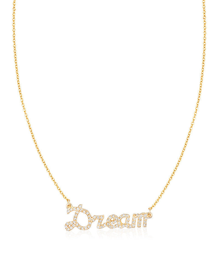 This Diamond Dream Necklace by Ariana Rabbani is a striking piece that features pave diamonds arranged to spell out the word 'Dream.' Set in 14k gold, this necklace inspires hope and ambition while exuding elegance. The minimalist yet powerful design makes it ideal for layering or wearing as a statement piece on its own. A perfect gift for dreamers or those in pursuit of their goals.