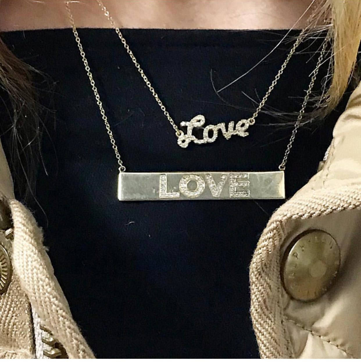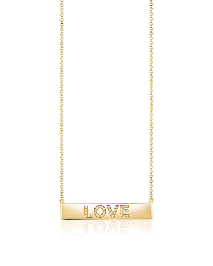 This Diamond LOVE Bar Necklace by Ariana Rabbani is a stunning piece that combines elegance with personalization. The bar pendant, set with micro pave diamonds, spells out 'LOVE,' making it a perfect symbol of affection. Crafted in 14k gold, this necklace is ideal for those who want to add a personal touch to their jewelry collection. Choose to personalize it with your own word or name, making it a unique and meaningful piece.