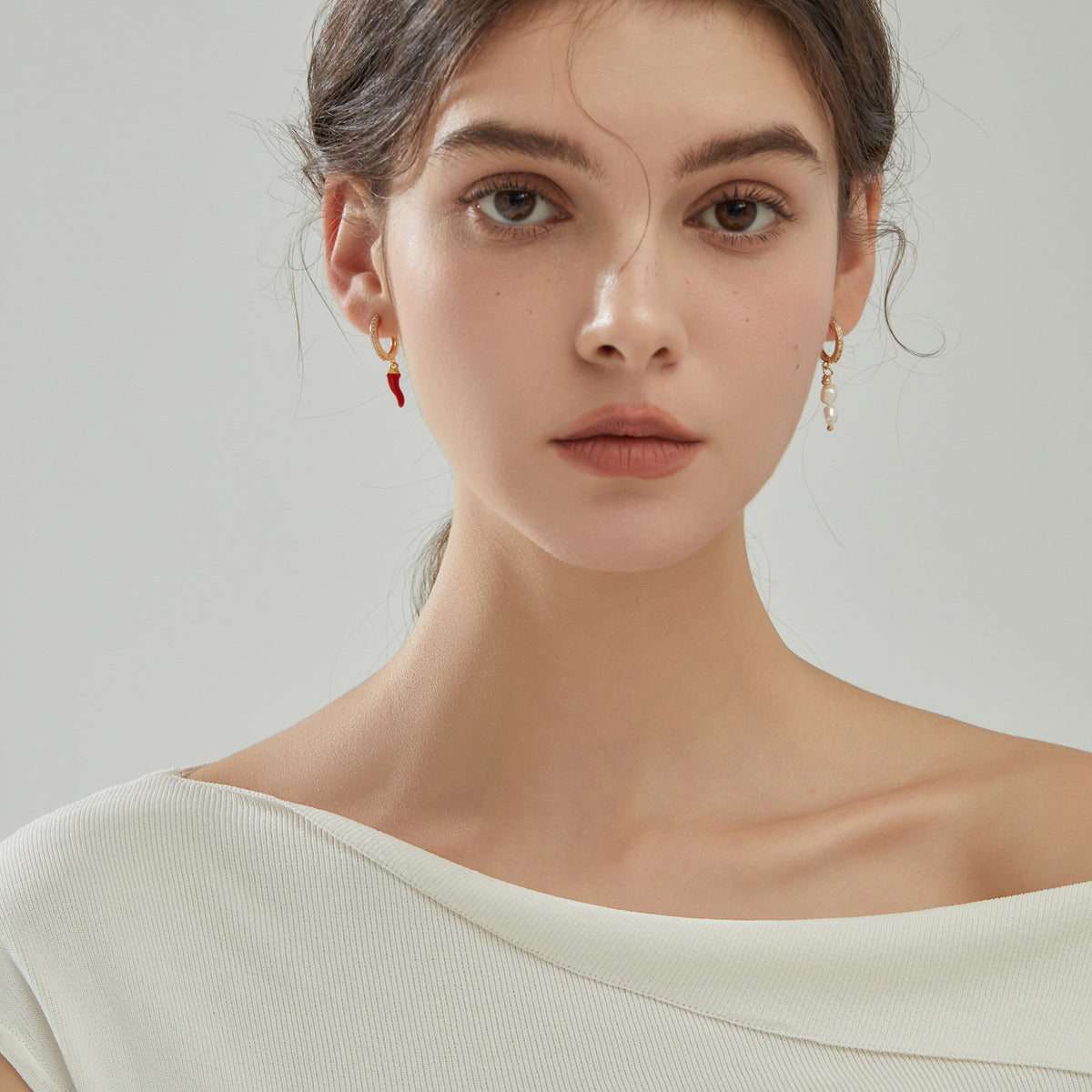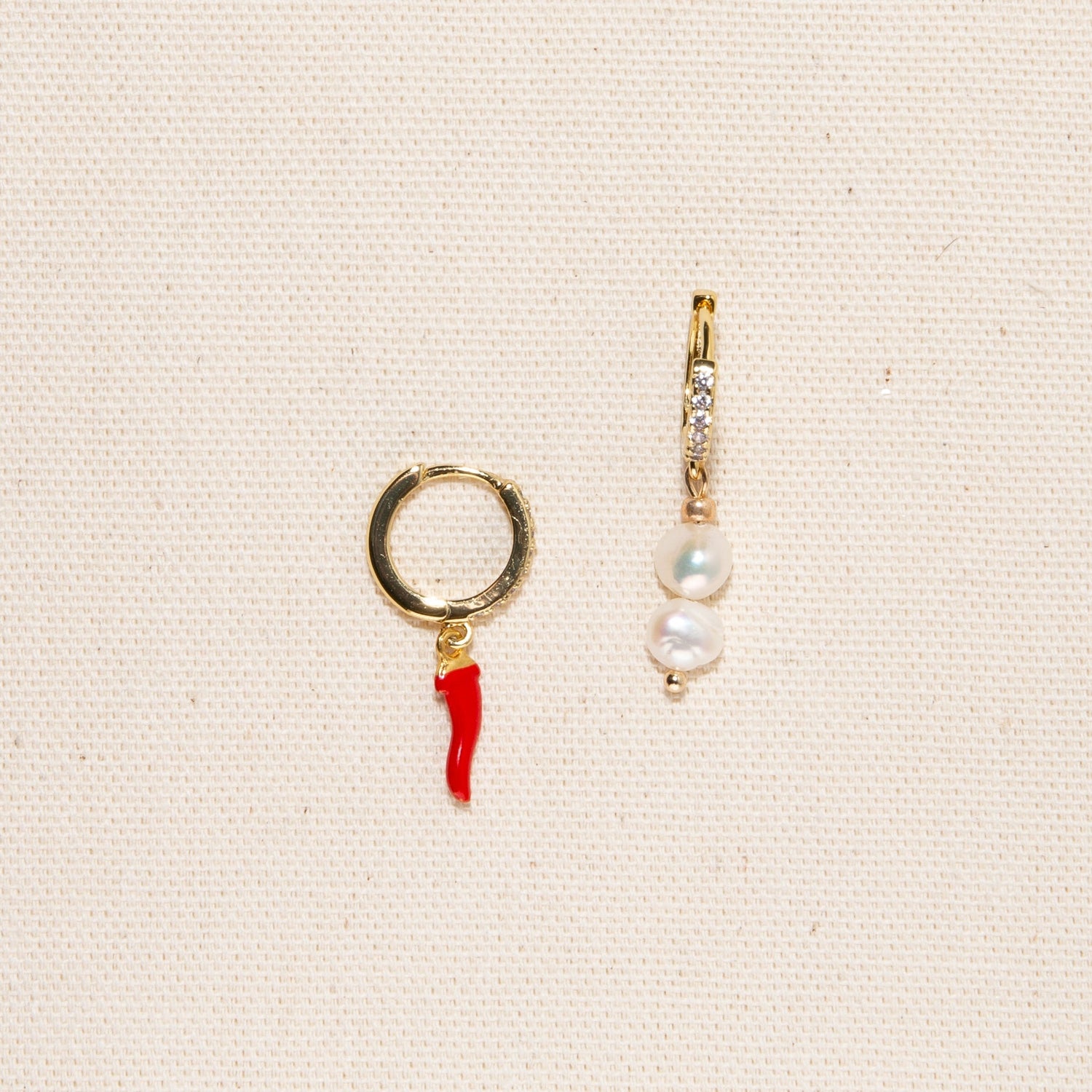 These Hot Chili Earrings - Limited Edition by Joey Baby feature a bold and unique design combining brass, zirconia, freshwater pearls, and a chili pendant. These earrings evoke fun and playfulness, while the combination of materials adds a touch of sophistication and style. Perfect for those who love to make a statement with their jewelry.