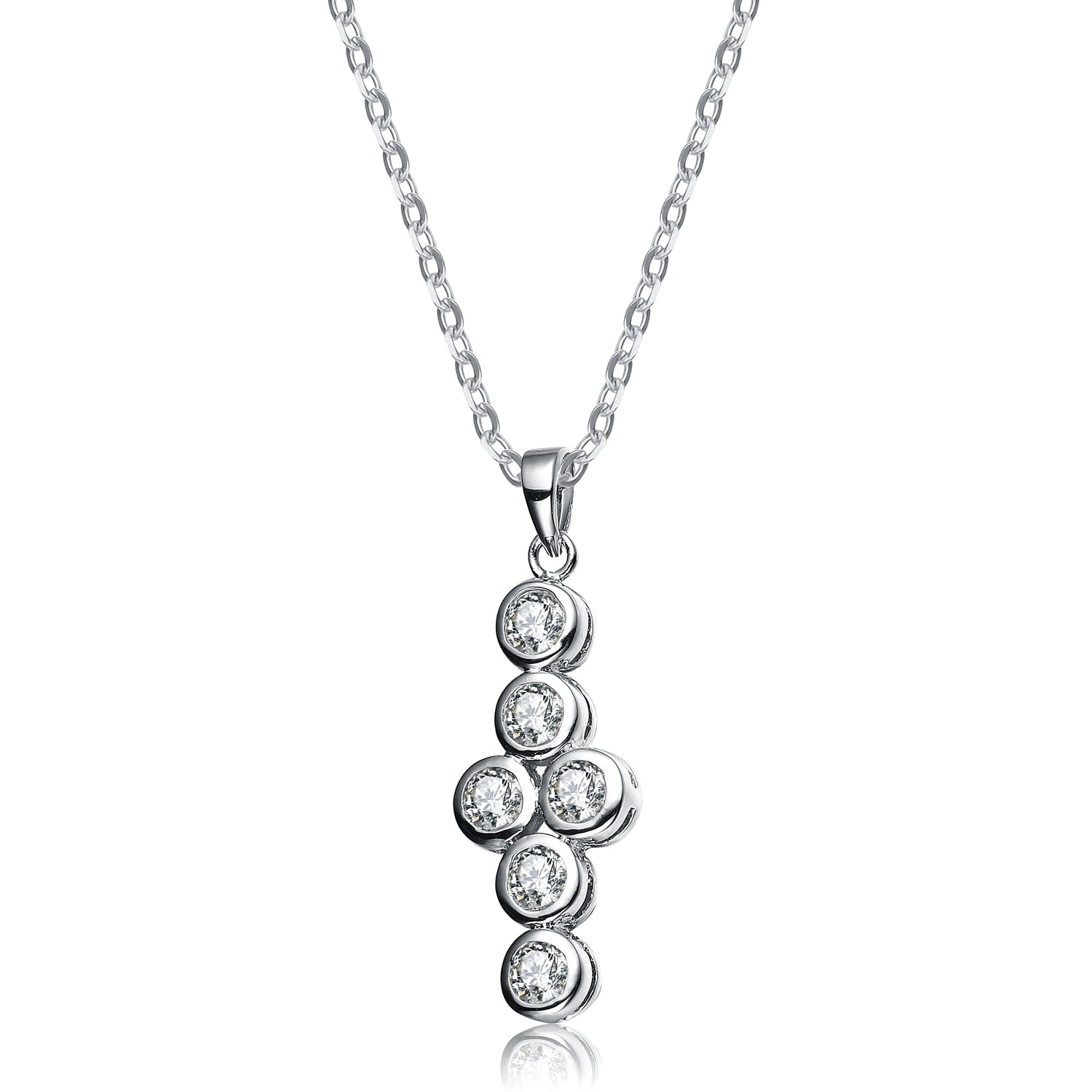 Crafted in sterling silver with white cubic zirconia stones. Includes chain with clasp closure.