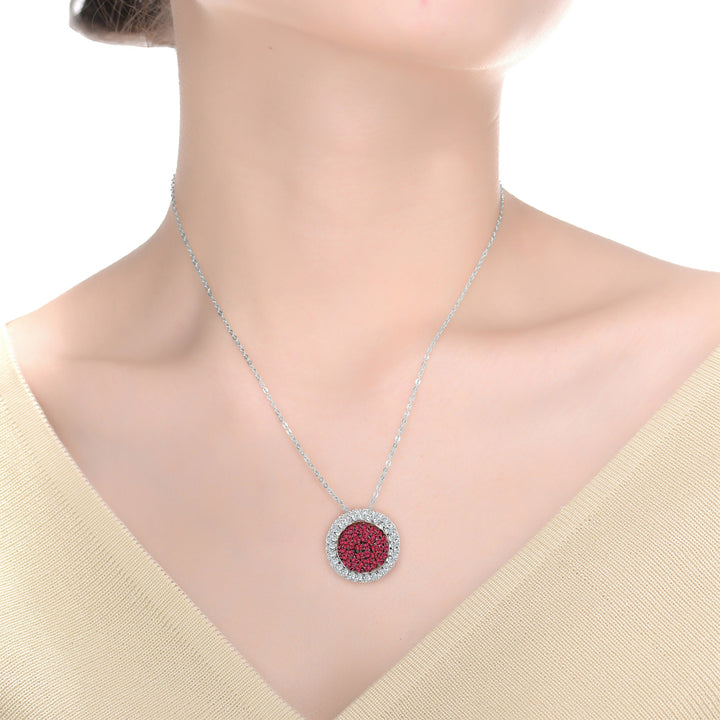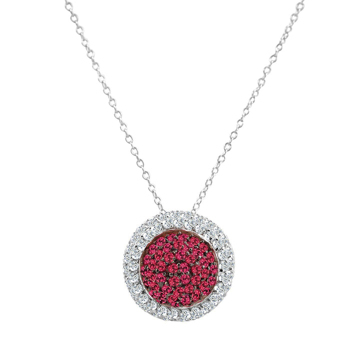Crafted in rhodium-plated sterling silver with cubic zirconia and a round ruby center stone. Includes chain with clasp closure.