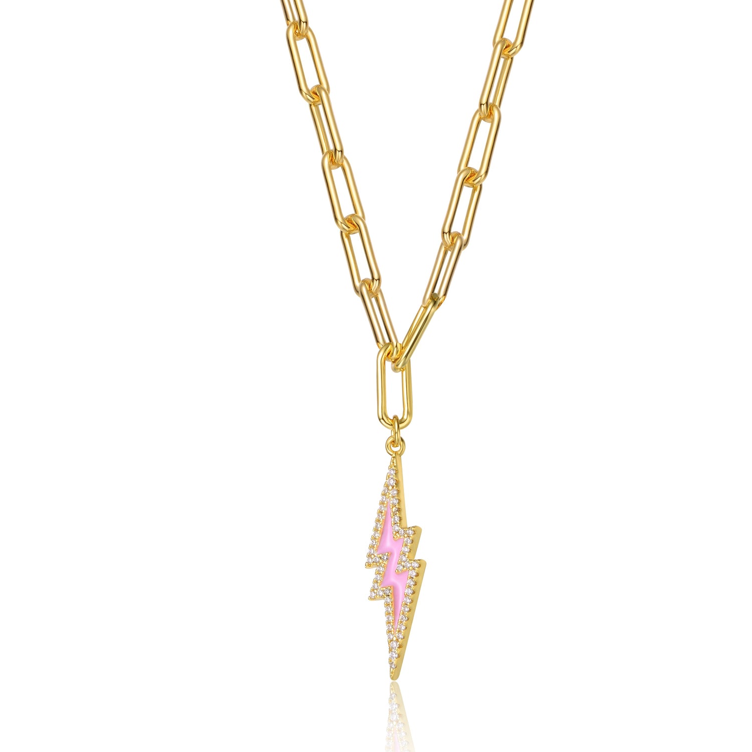 Crafted in 14k gold plating with cubic zirconia stones and a pink inlaid charm. Charm measures 0.75 inches in length. Attached to a paper clip link chain, secured with a spring ring clasp.