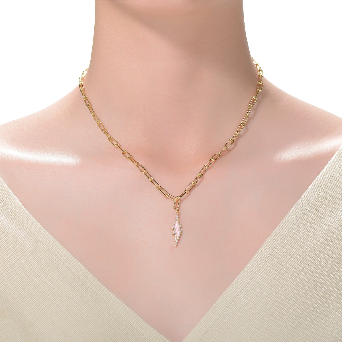 This 14k Gold Plated Cubic Zirconia Charm Necklace by Rachel Glauber is a luxurious and stylish piece, featuring a unique thunderbolt charm design adorned with small clear round cubic zirconia stones. The charm is set with a pink inlay in the center, offering a perfect contrast against the gleaming gold plating. This necklace serves as a symbol of power and strength, while maintaining a chic, modern look. Ideal for layering or wearing on its own, this piece adds a personal touch to any jewelry collection.