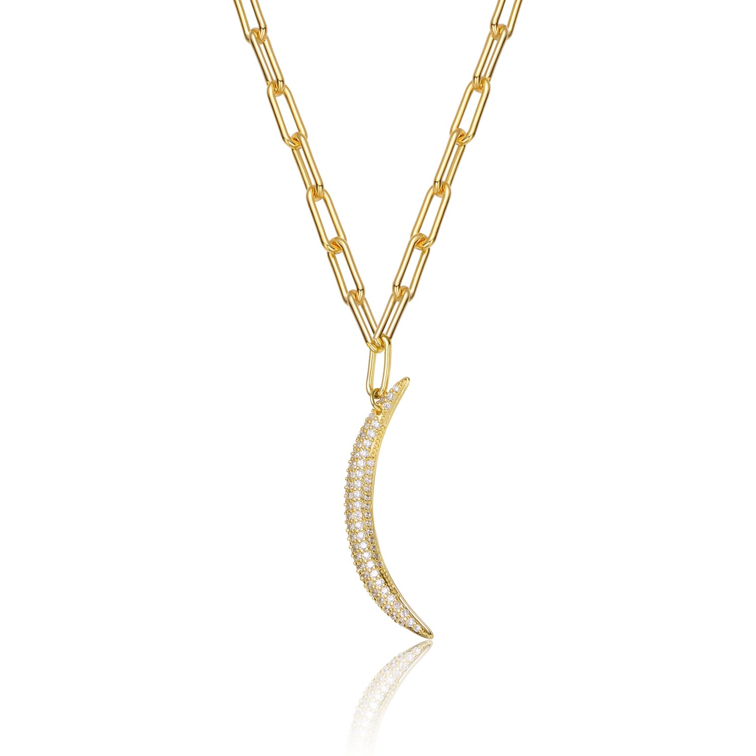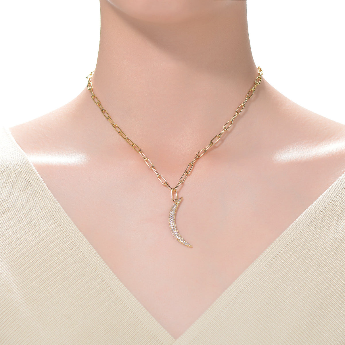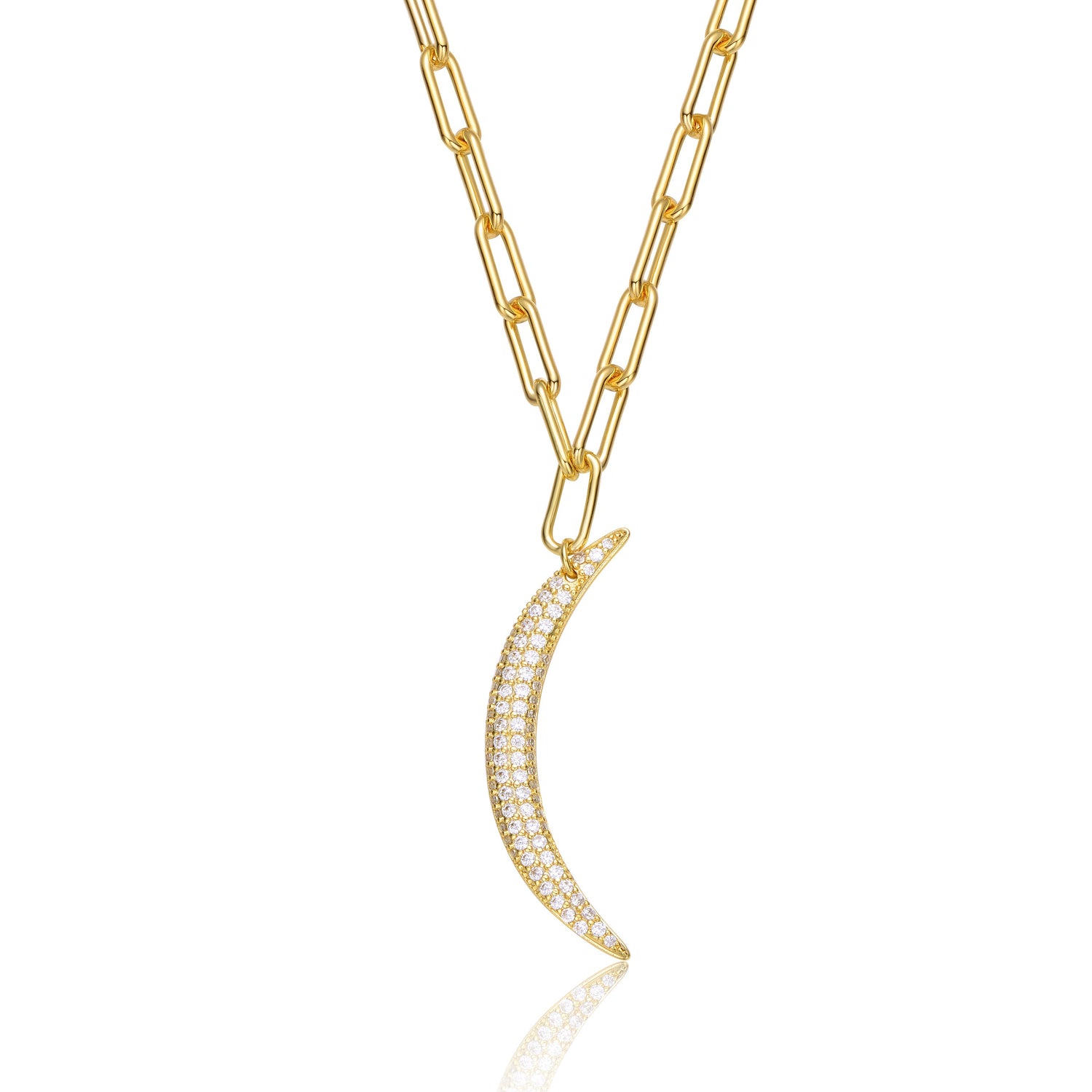 Crafted in 14k gold plating with clear cubic zirconia stones. Moon charm measures 0.8 inches in length. Attached to a paper clip link chain, secured with a spring ring clasp.