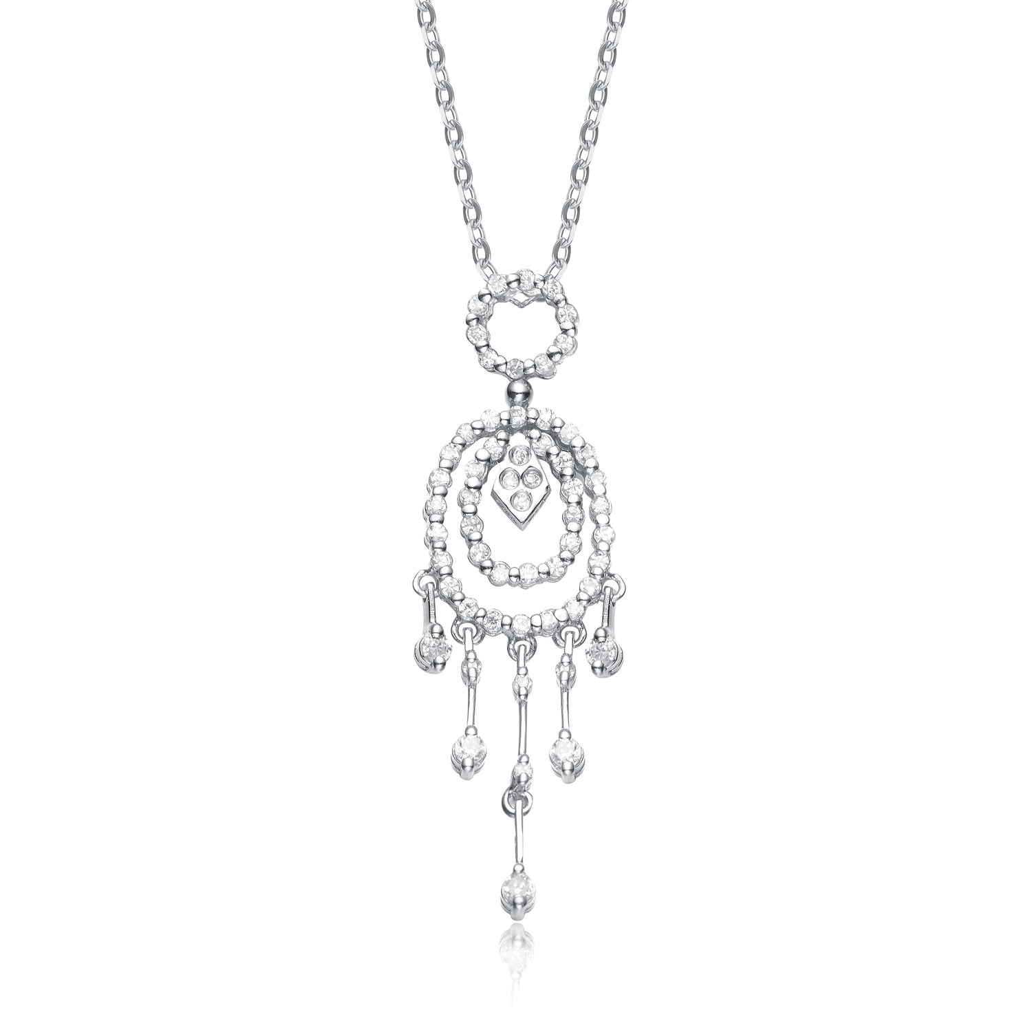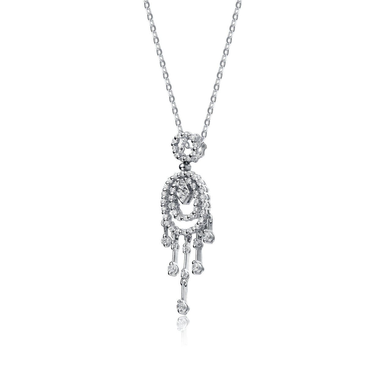 Crafted in sterling silver with clear cubic zirconia stones. Features oval shapes with five dangling cubic zirconia accents. Pendant measures approximately 1.25 inches in length. Suspended from a delicate silver chain, secured with a spring ring clasp.