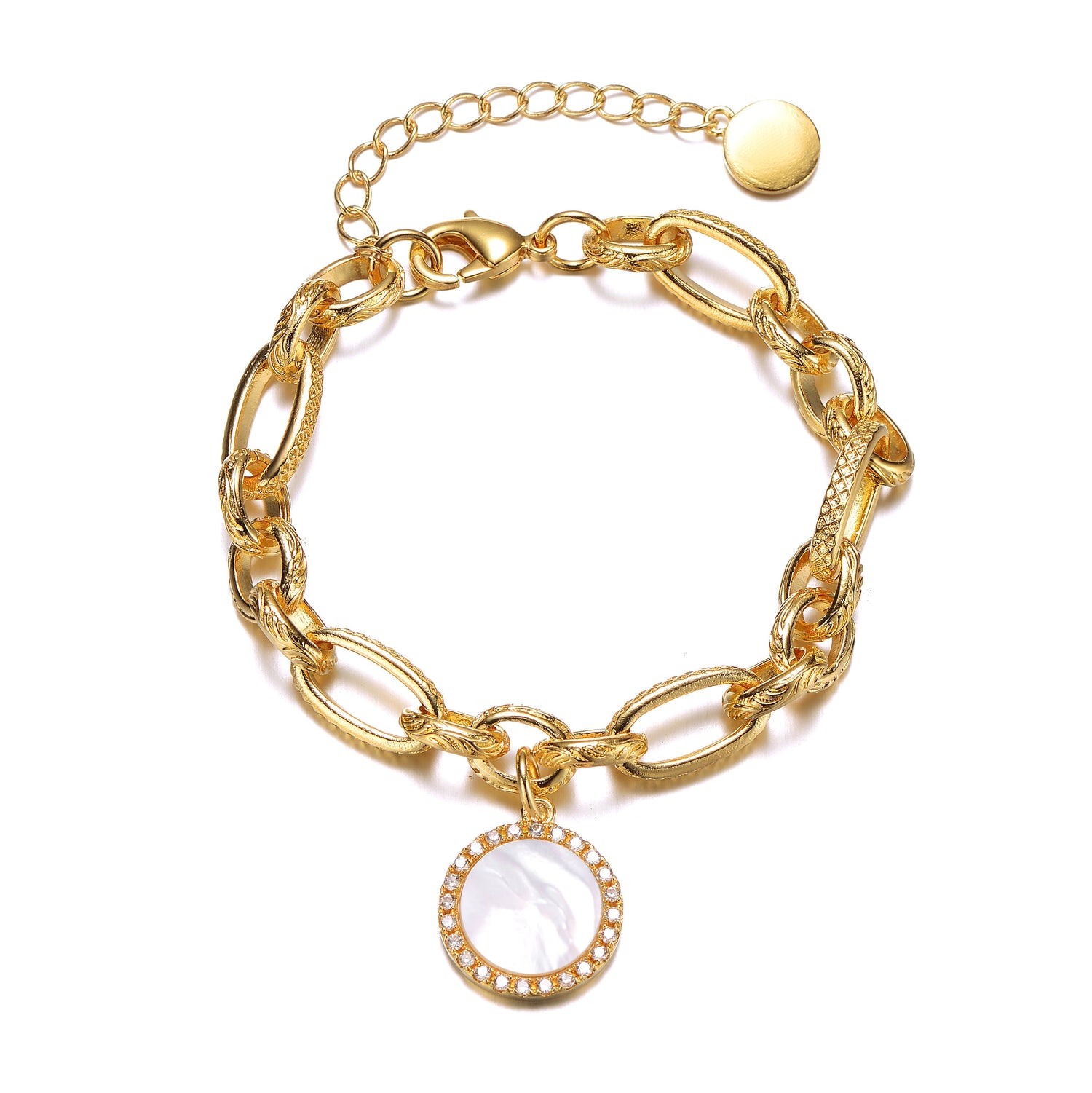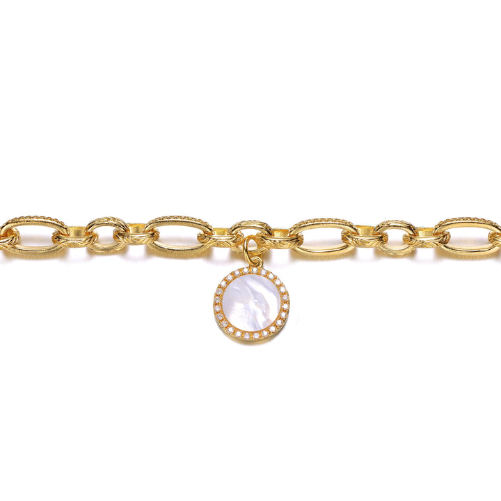 Crafted in 14k gold plating with clear cubic zirconia stones. Features a round charm with large cubic zirconia in the center. Bracelet measures approximately 7 inches in length. Secured with a toggle clasp for easy wear.