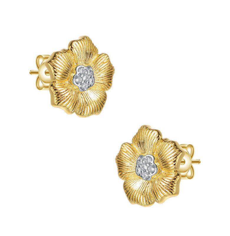 These 14k Gold Plated and Cubic Zirconia Floral Stud Earrings by Rachel Glauber feature a flower design with five textured 14k gold-plated petals. The center is white gold-plated and accented with small clear round cubic zirconia stones. These elegant earrings are secured with a butterfly closure and measure 14.5mm. Perfect for any occasion, these studs also make a thoughtful gift.