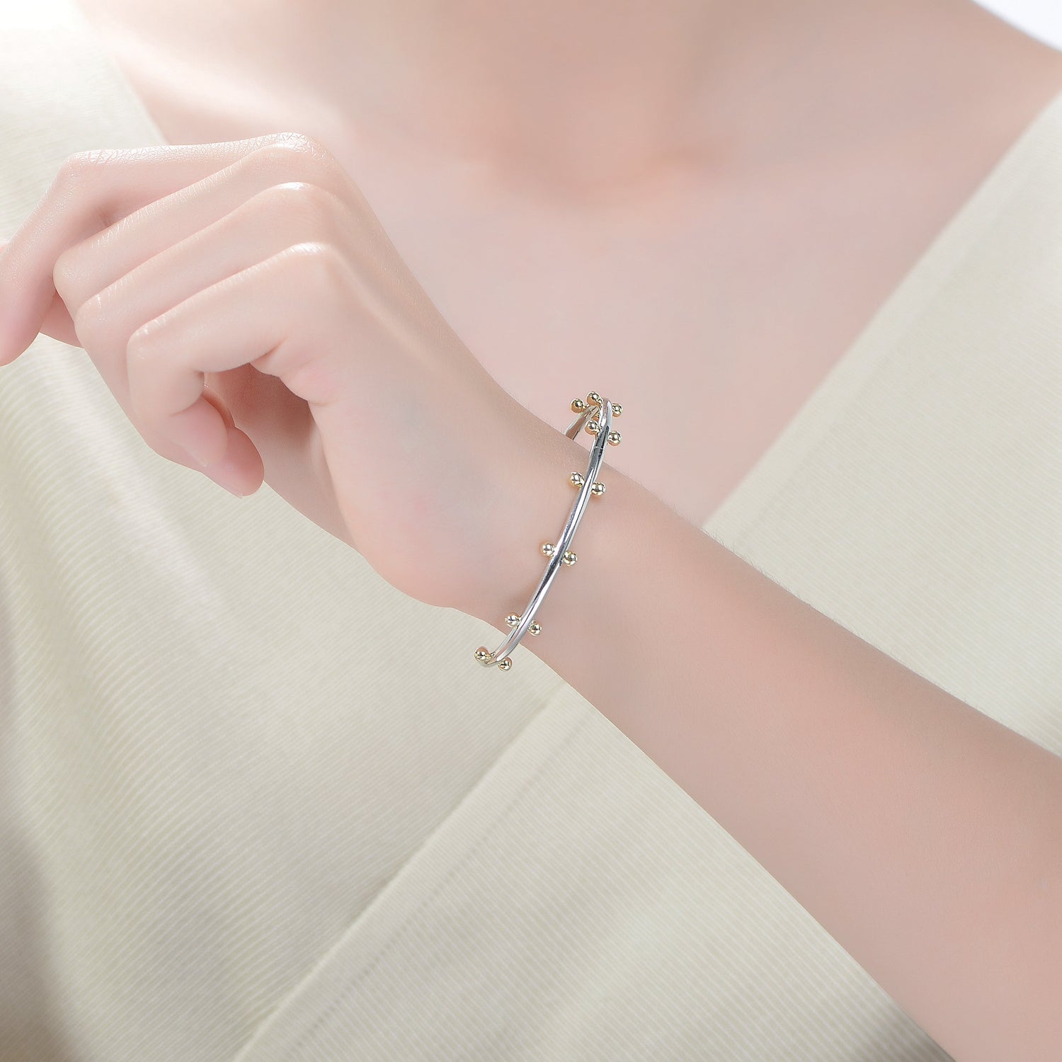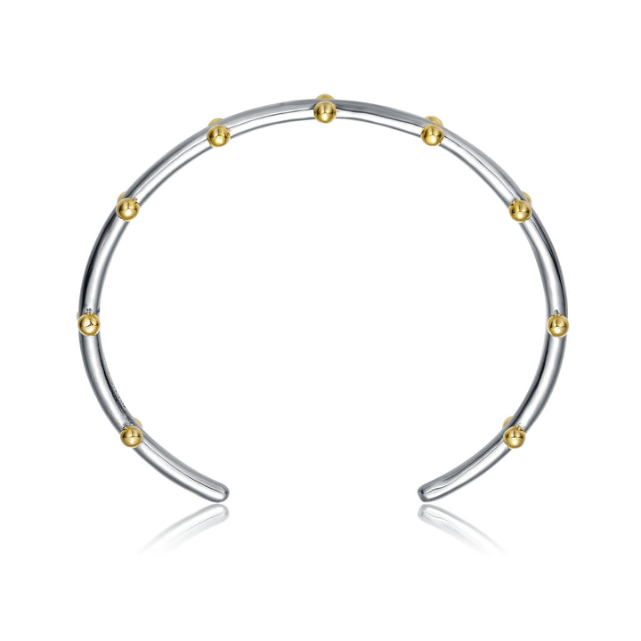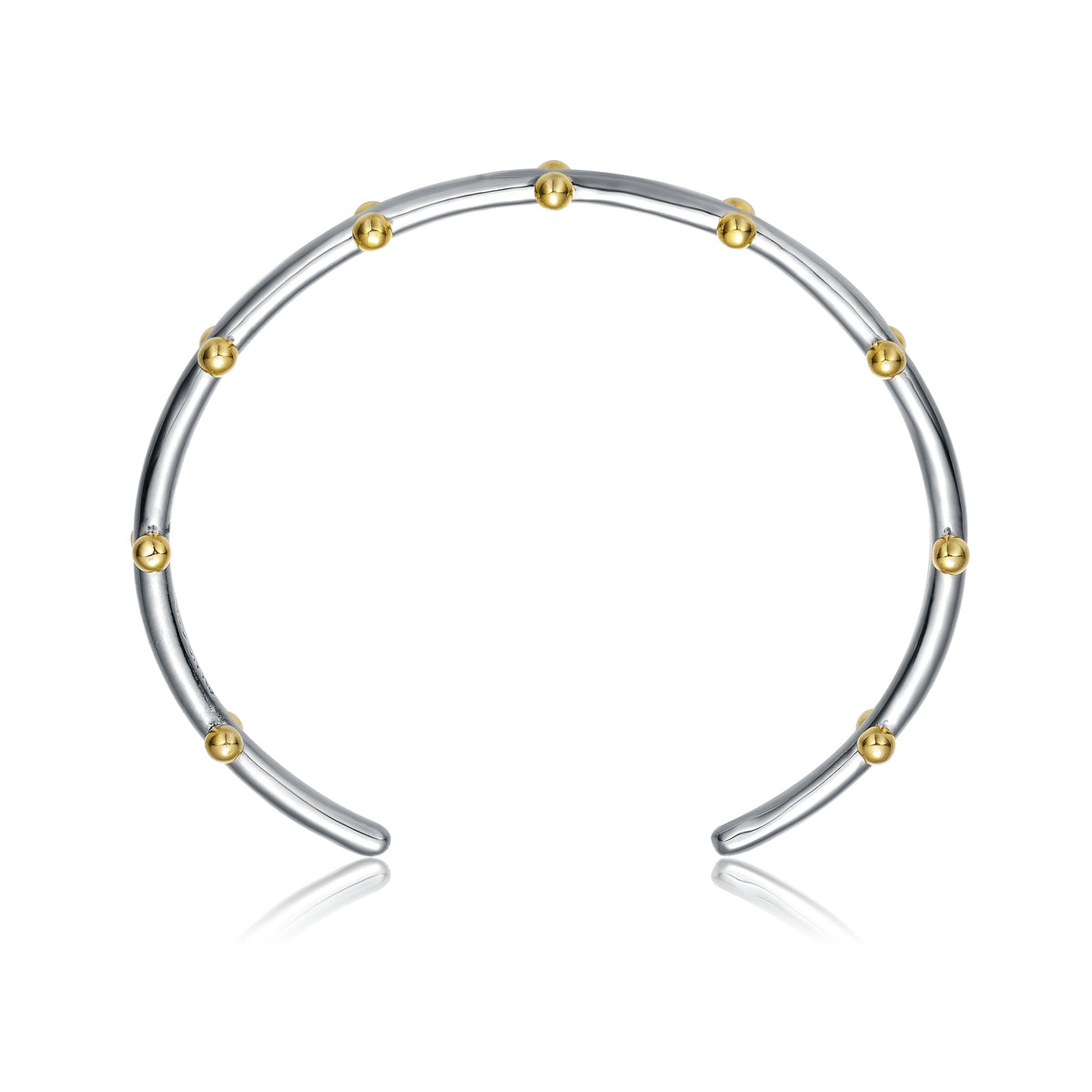 This Rhodium and 14k Gold Plated Cuff Bracelet by Rachel Glauber offers an elegant design with a silver cuff accented with gold-plated beads on both sides. Secured by gently pushing the cuff to fit, this bracelet is perfect for stylish combinations and can also be a great gift for any special occasion.