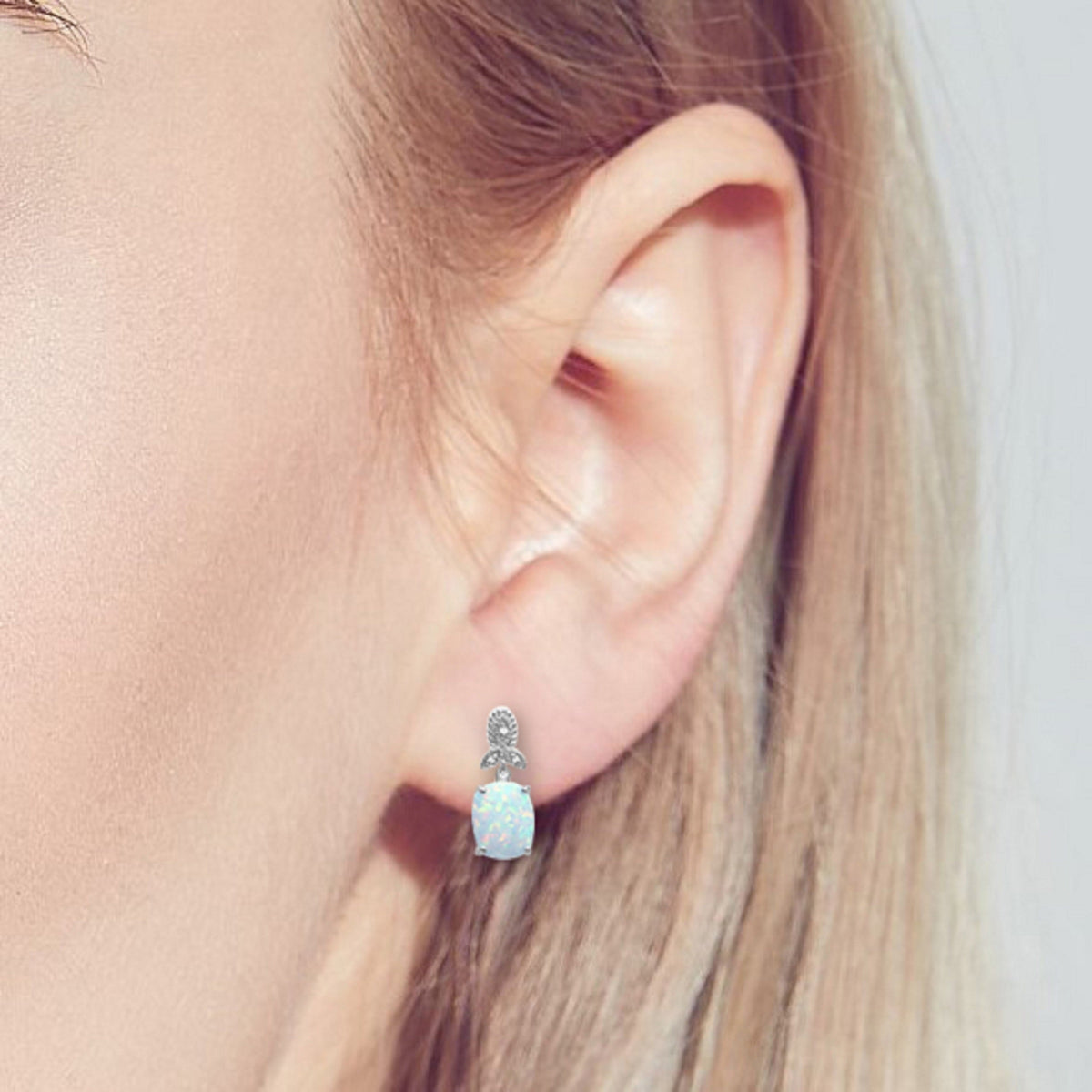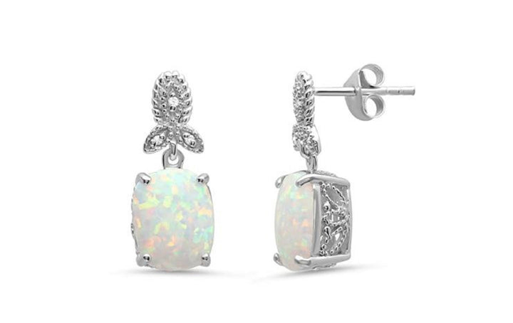 Sterling Silver 10x8mm Created Opal and Diamond Accent Dangle Drop Earrings