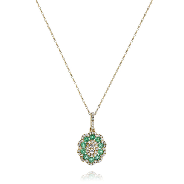 Crafted in 14K yellow gold with 0.19 carats of diamonds and 0.06 carats of emeralds (G-H color, SI clarity). 1.24 grams in weight. 66 stones total.