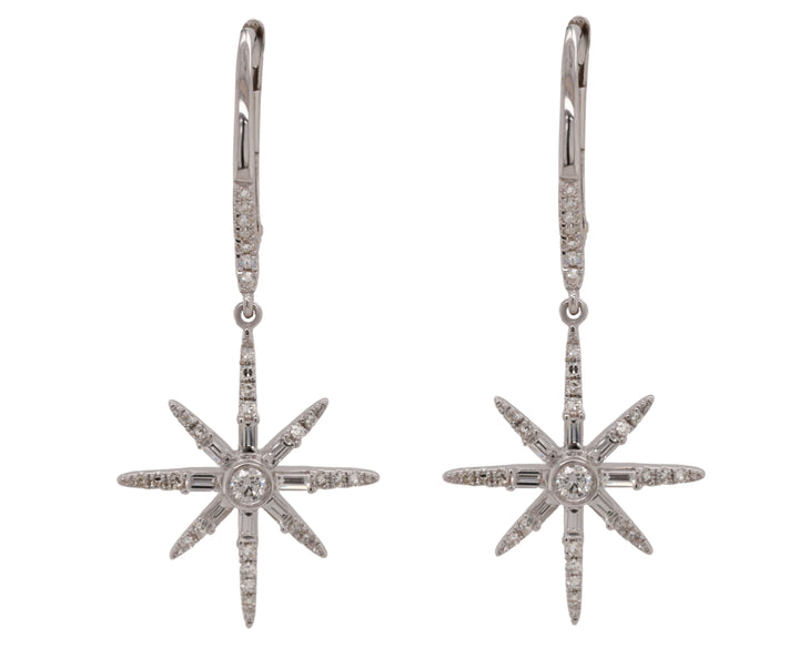 Crafted in 14KT White Gold with diamonds totaling 0.21 carats and gemstones totaling 0.17 carats. The earrings weigh 2.33 grams. Each diamond is SI clarity and G-H in color.