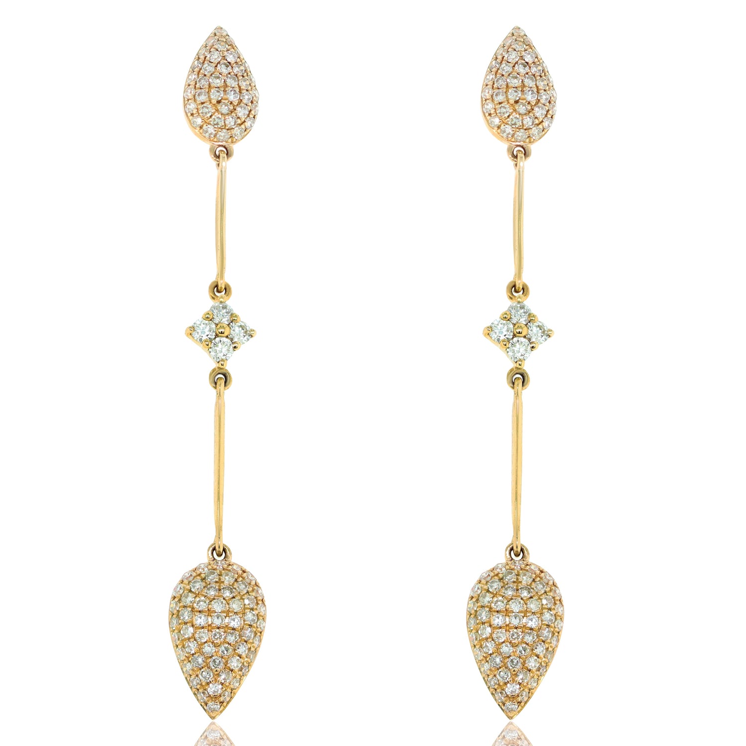 These Diamond Drop Earrings by Diana M are a luxurious statement piece, crafted in 14KT yellow gold. Featuring 0.70 carats of white round diamonds, the earrings combine elegance with brilliance. Their drop design enhances the diamonds' natural sparkle, making them perfect for formal events or evening wear. The 188 stones are meticulously set to create an eye-catching effect, ensuring you shine with sophistication.
