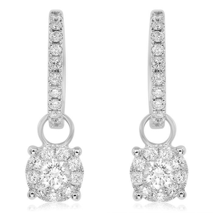 Handcrafted in 14KT White Gold with 1.23 carats of diamonds totaling 42 stones. The earrings weigh 2.67 grams. Each diamond is SI clarity and G-H in color.
