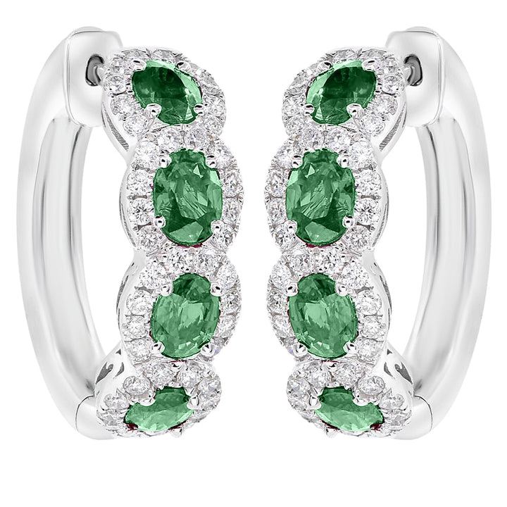 These Diana M Diamond Earrings by Diana M blend classic elegance with modern design. Featuring 0.65 carats of diamonds and 1.50 carats of emeralds, set in 18k white gold, these earrings offer a vibrant contrast between the sparkling diamonds and the rich green emeralds. Perfect for making a bold statement, these earrings symbolize luxury, beauty, and sophistication, ideal for special occasions or evening wear.
