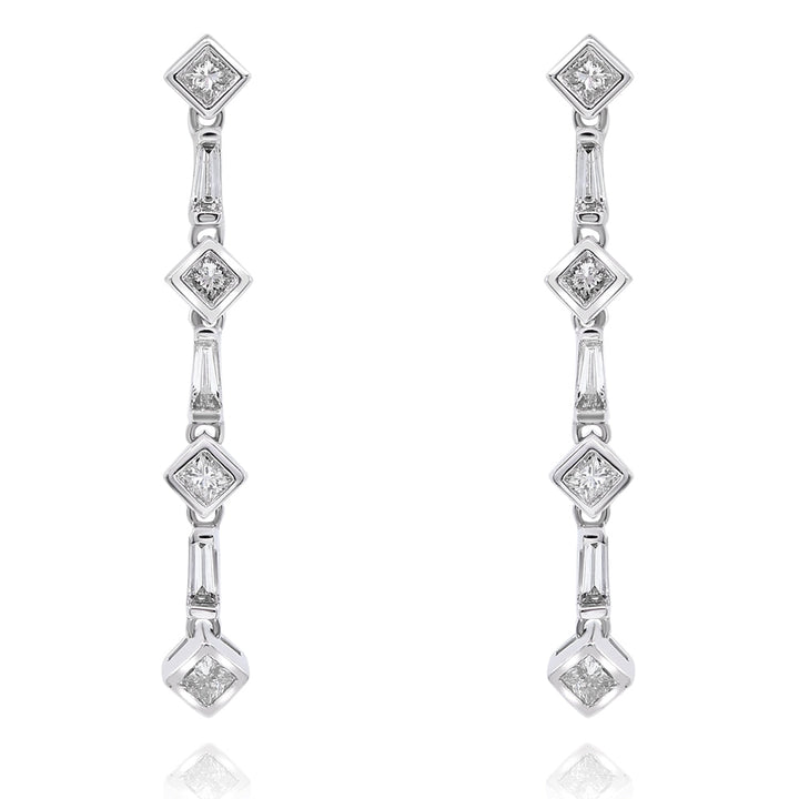 These Diana M Diamond Earrings by Diana M feature 0.26-carat baguette cut diamonds and 0.50-carat princess cut diamonds, set in 18k white gold. The earrings' elegant design and radiant diamonds offer a perfect blend of sophistication and glamour, making them ideal for formal events or evening wear. Their striking appearance conveys luxury, elegance, and timeless beauty.