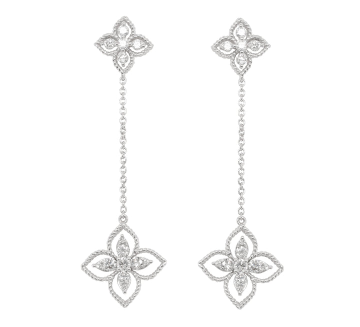 Crafted in 14-karat white gold, these earrings feature 28 round brilliant diamonds totaling 0.59 carats. The diamonds are G-H color, SI clarity. The total weight is 2.86 grams.