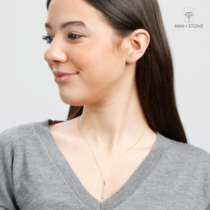 This 14k Yellow Gold Bar Pendant Necklace by MaxColor is a refined everyday essential with a vibrant gemstone accent. The delicate bar pendant is adorned with a securely hand-set 3mm gemstone, offering a subtle pop of color. Its sleek design and adjustable chain make it a timeless layering piece.