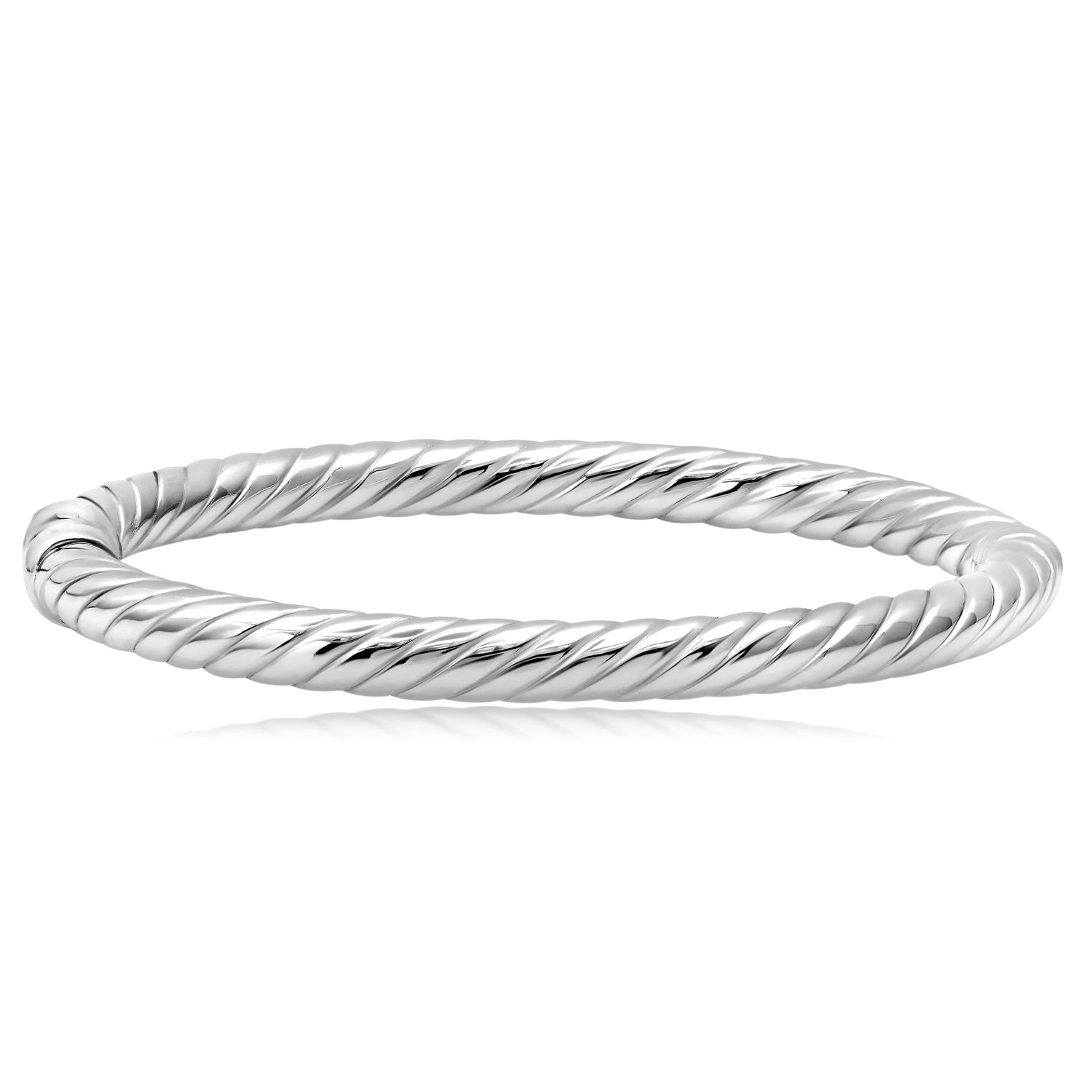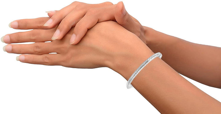 This Sterling Silver Braided Bangle Bracelet by MaxColor is a beautifully textured statement piece. Its intricate braided design creates a sophisticated yet relaxed aesthetic, making it a versatile accessory for both casual and formal wear.