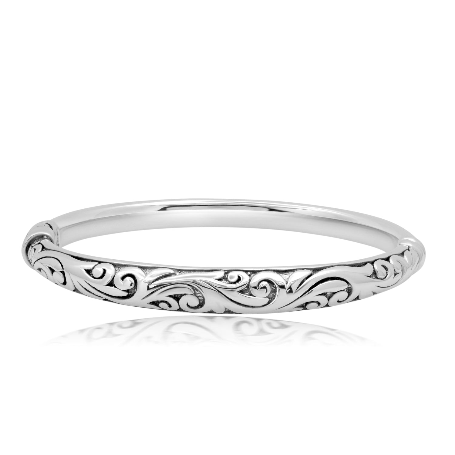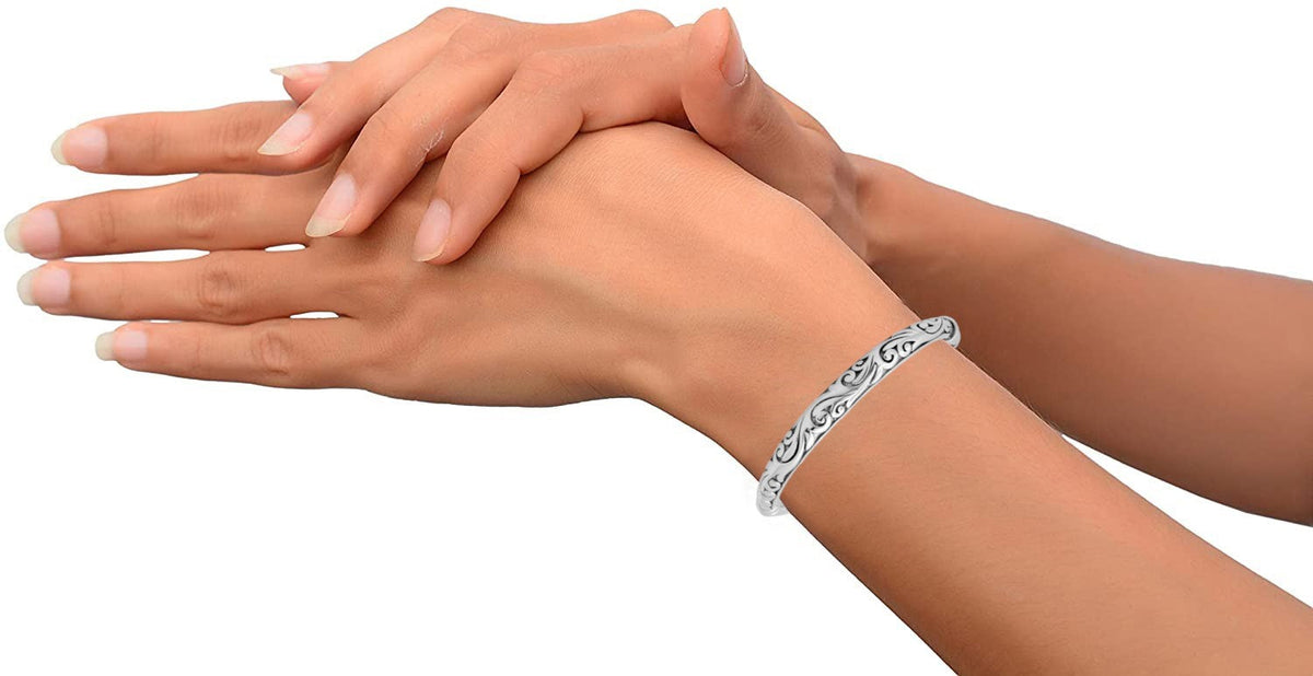 This Sterling Silver Filigree Bangle Bracelet by MaxColor showcases exquisite craftsmanship with its delicate filigree detailing. The intricate openwork pattern lends a vintage charm, making it a timeless addition to any jewelry collection.