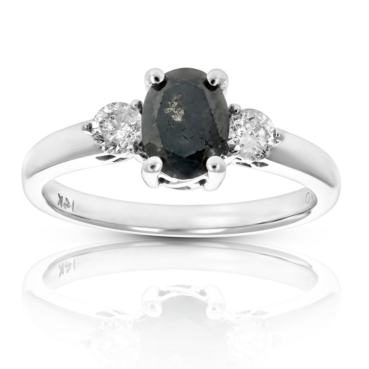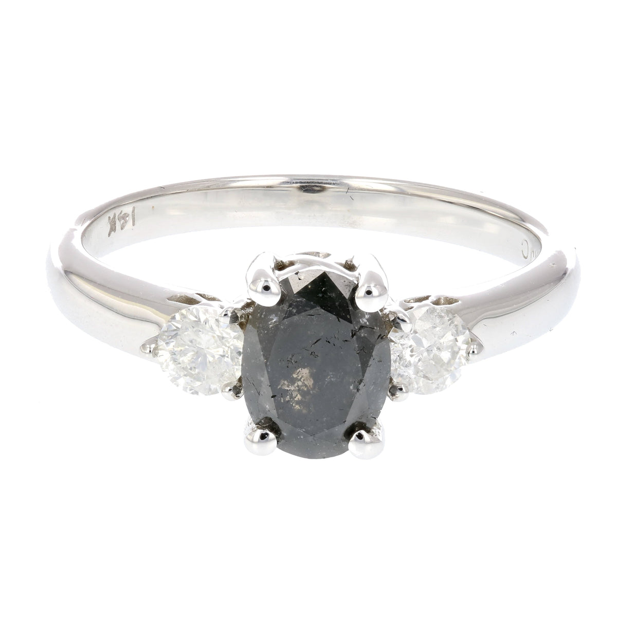 Crafted in 14k white gold, this ring features natural black and white diamonds totaling 1.93 cttw. The diamonds are oval and round-cut, with a clarity of I1-I2 and a color range of J-K.