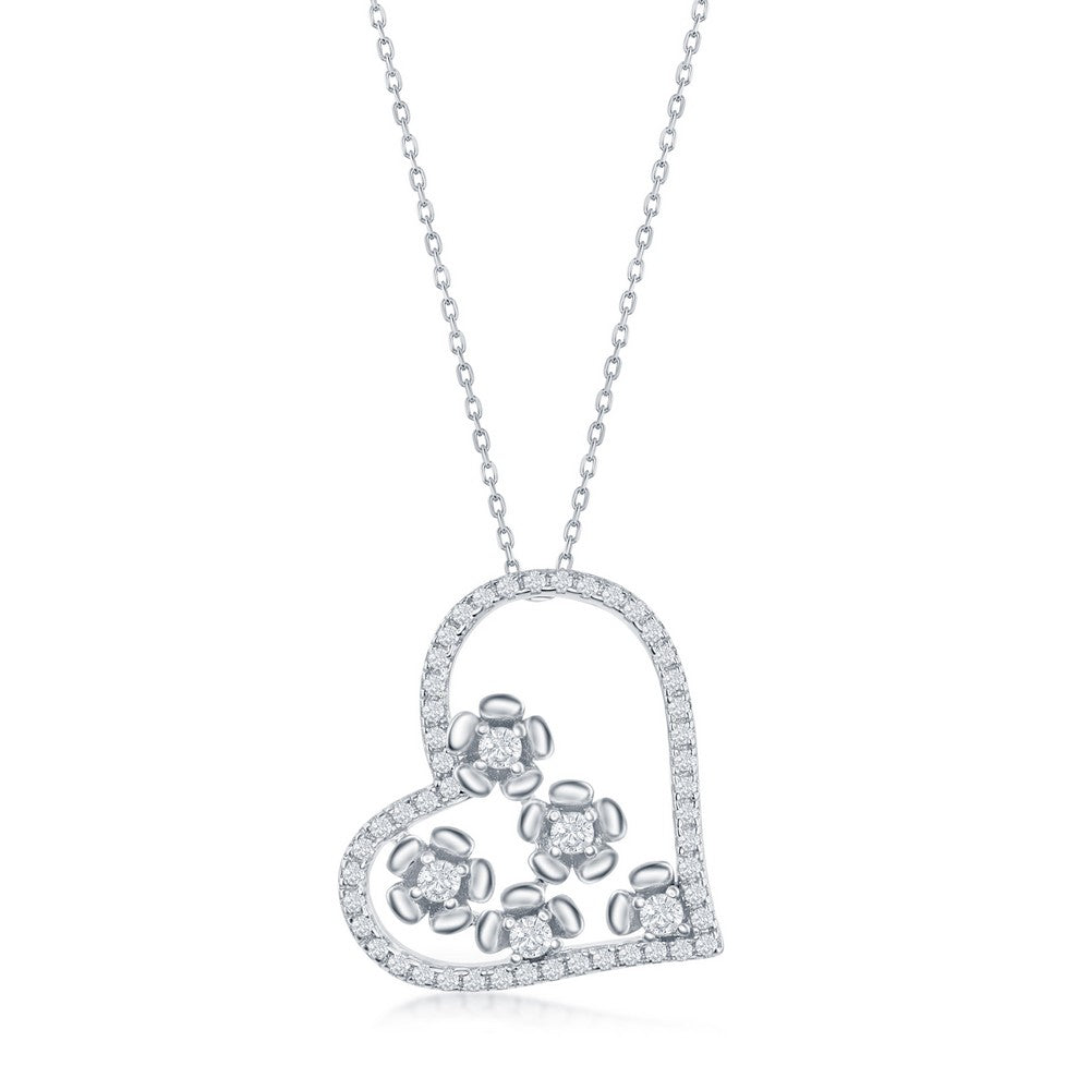 Sterling Silver CZ Ruby Heart and Flowers Necklace - Rose Gold Plated