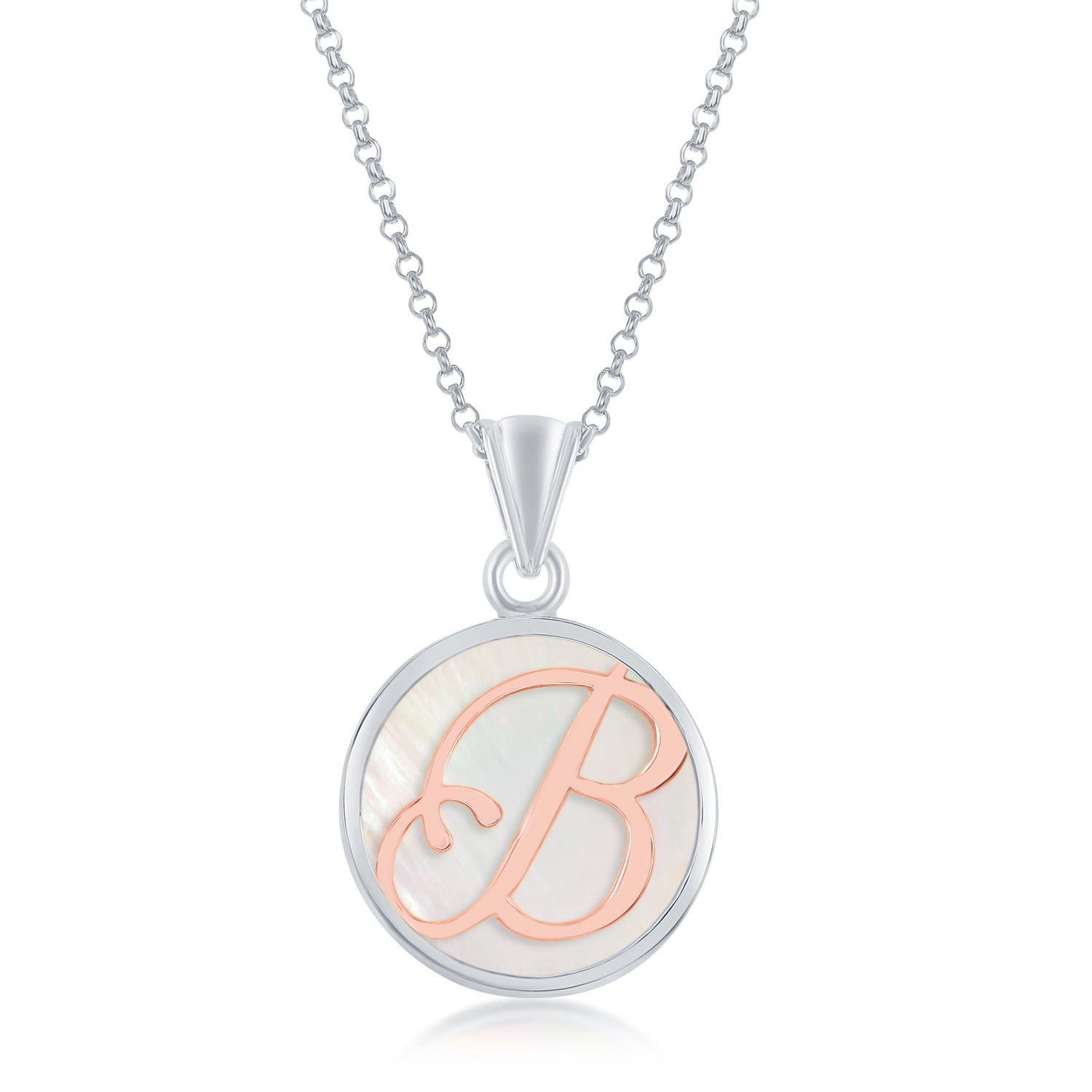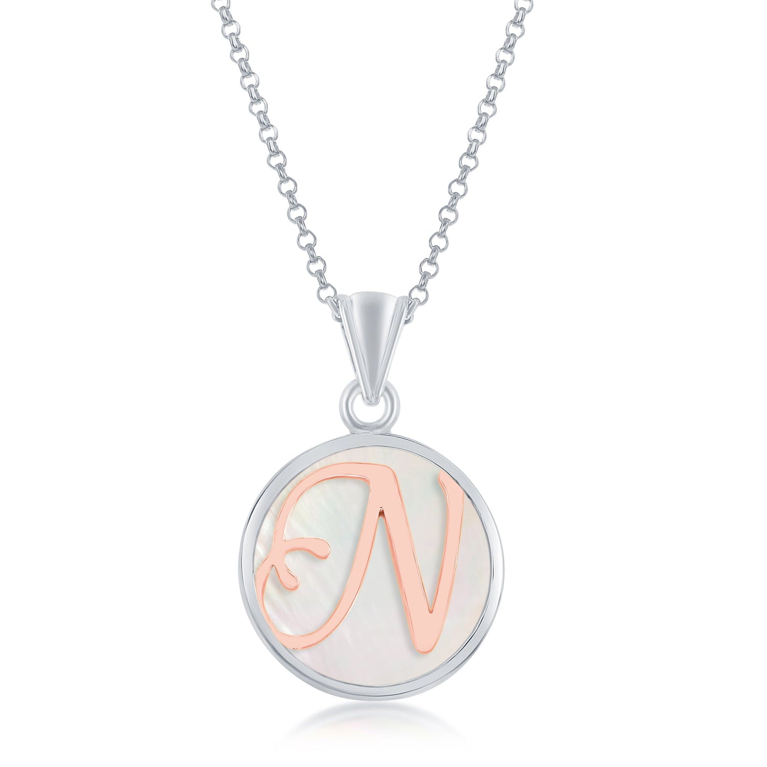 Sterling Silver MOP Pendant, Rose Gold Script Initial W/Chain