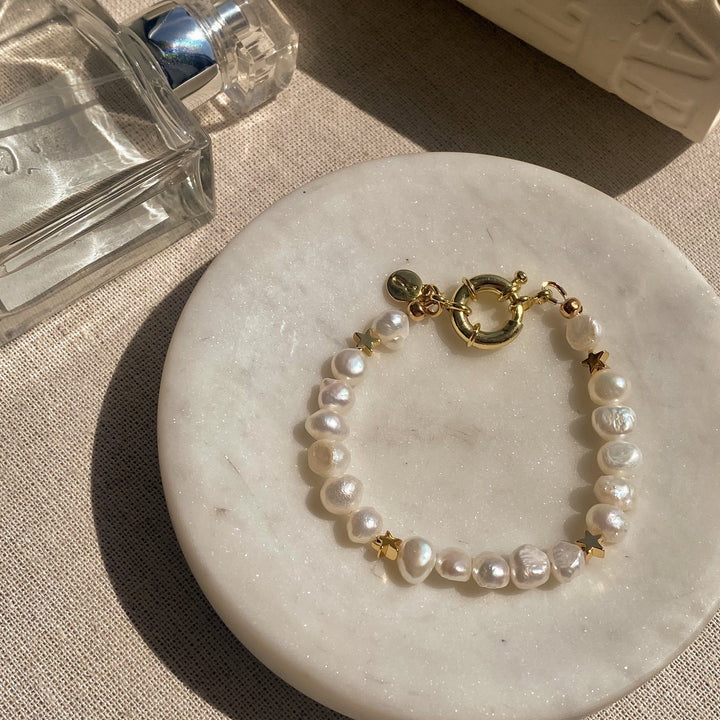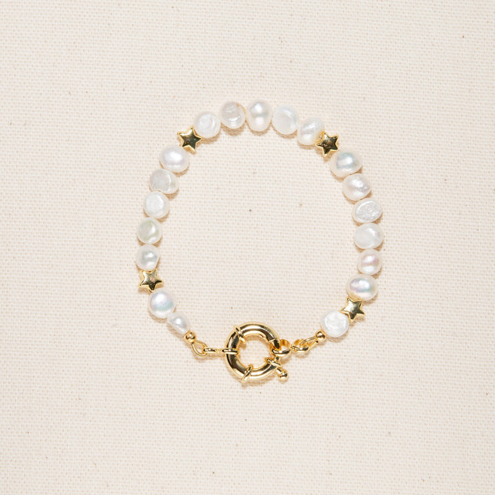 The Twinkie Bracelet by Joey Baby is a playful yet elegant design that blends celestial elements with timeless pearls. Handmade in Manhattan, this bracelet features 18K gold-plated stars and luminous freshwater pearls, creating a piece that is both sophisticated and charming.