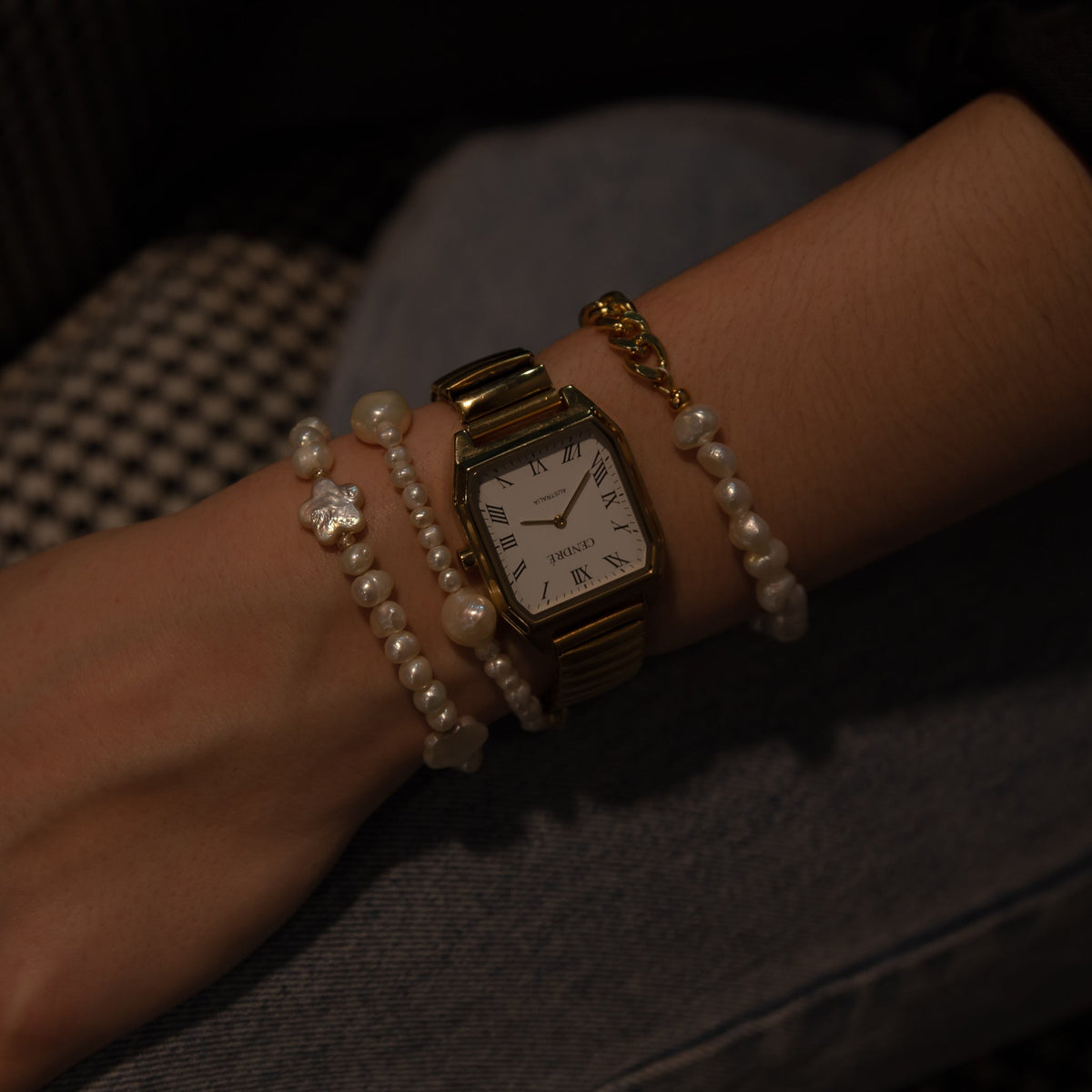 Crafted with freshwater pearls and 18K gold-plated brass. Measures approximately 7 inches. Adjustable fit recommendations included.