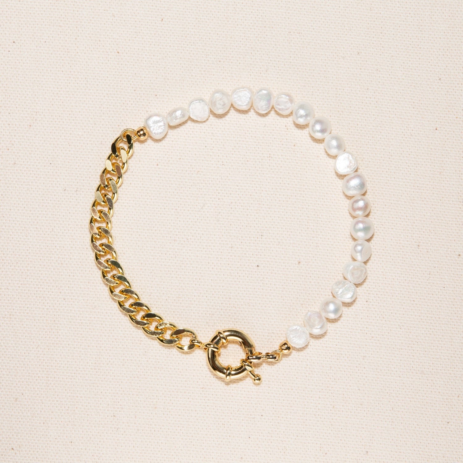 The Lauren Pearl Chain Bracelet by Joey Baby merges modern and classic aesthetics with its combination of Cuban chain links and luminous freshwater pearls. This versatile piece is designed for layering or wearing alone as a statement accessory.