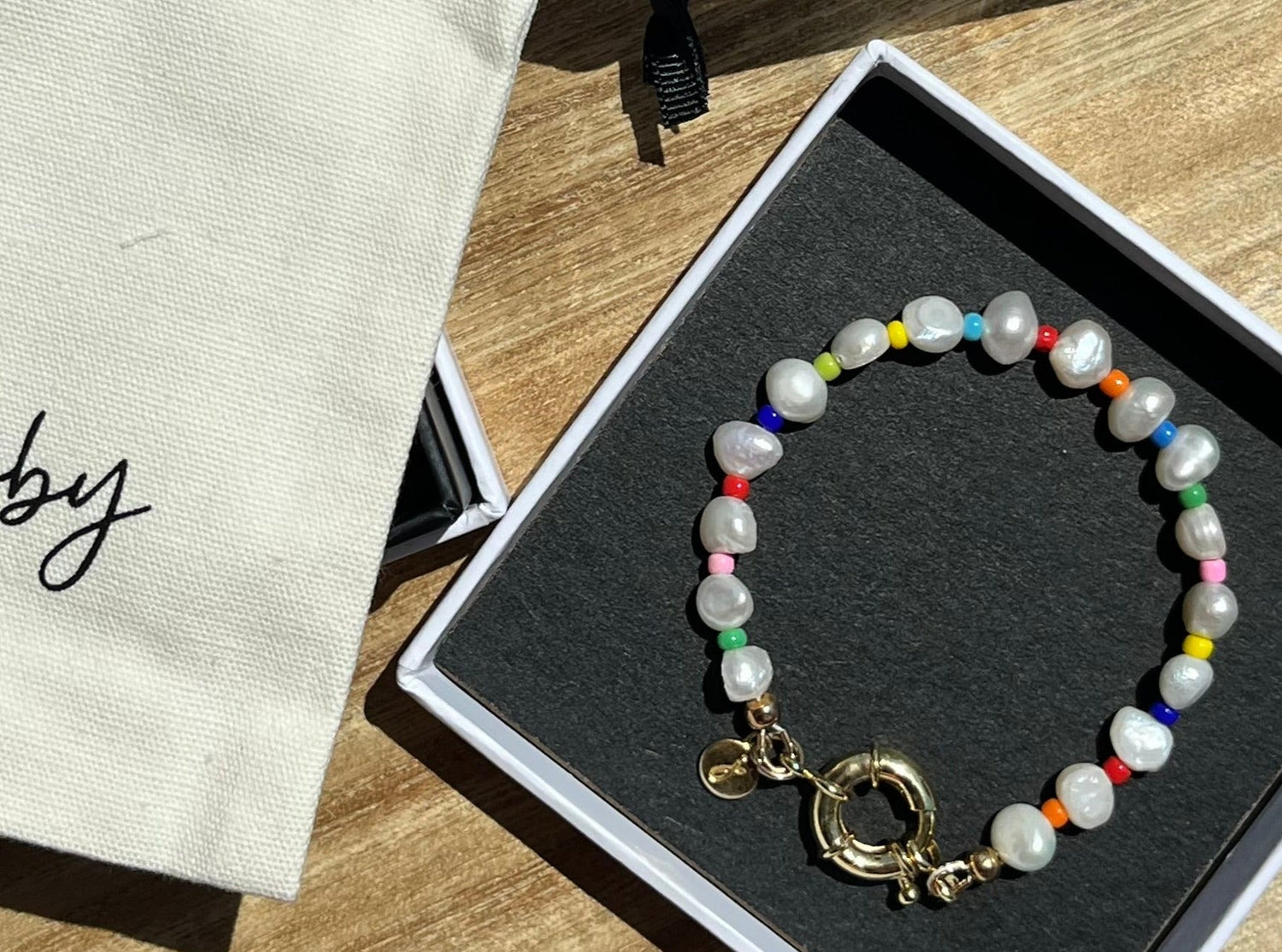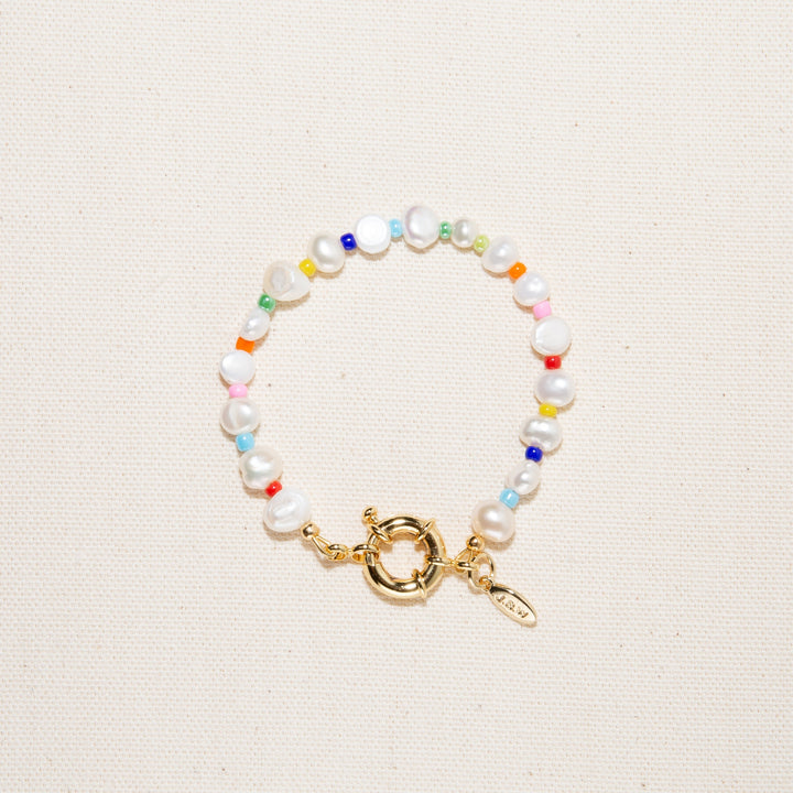 The Amber Bracelet by Joey Baby is a vibrant and elegant piece, blending the classic allure of freshwater pearls with the playful charm of rainbow-colored glass beads. Inspired by New York’s sophisticated culture, this bracelet is handcrafted for a unique and colorful statement.